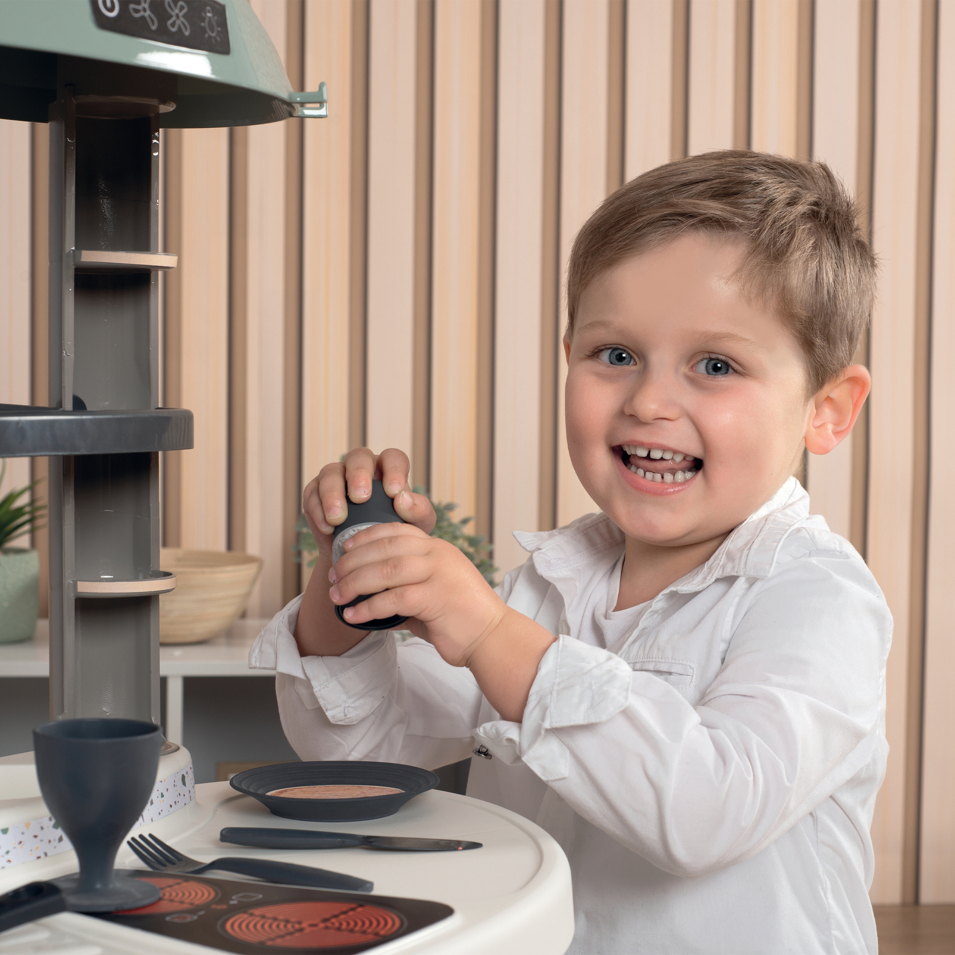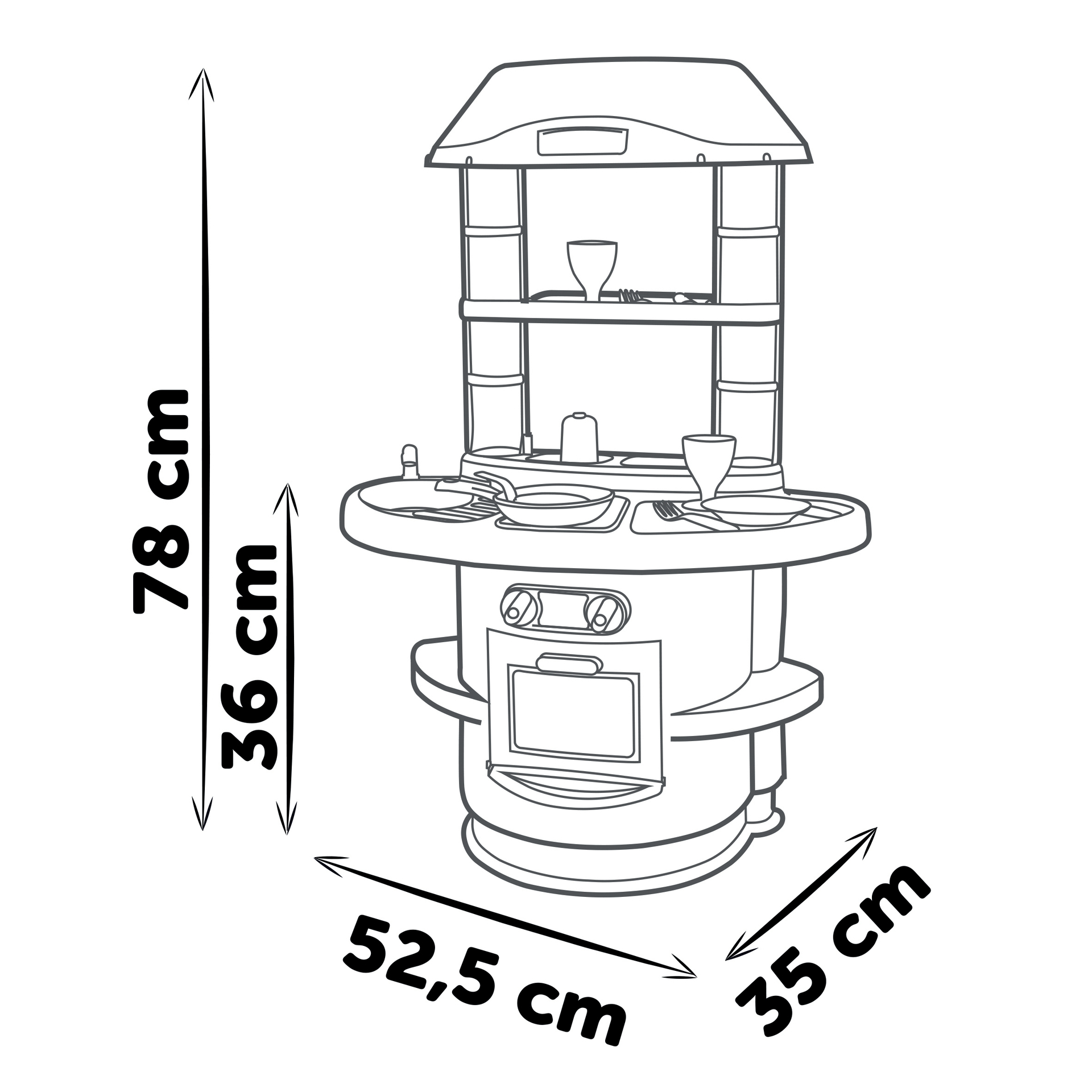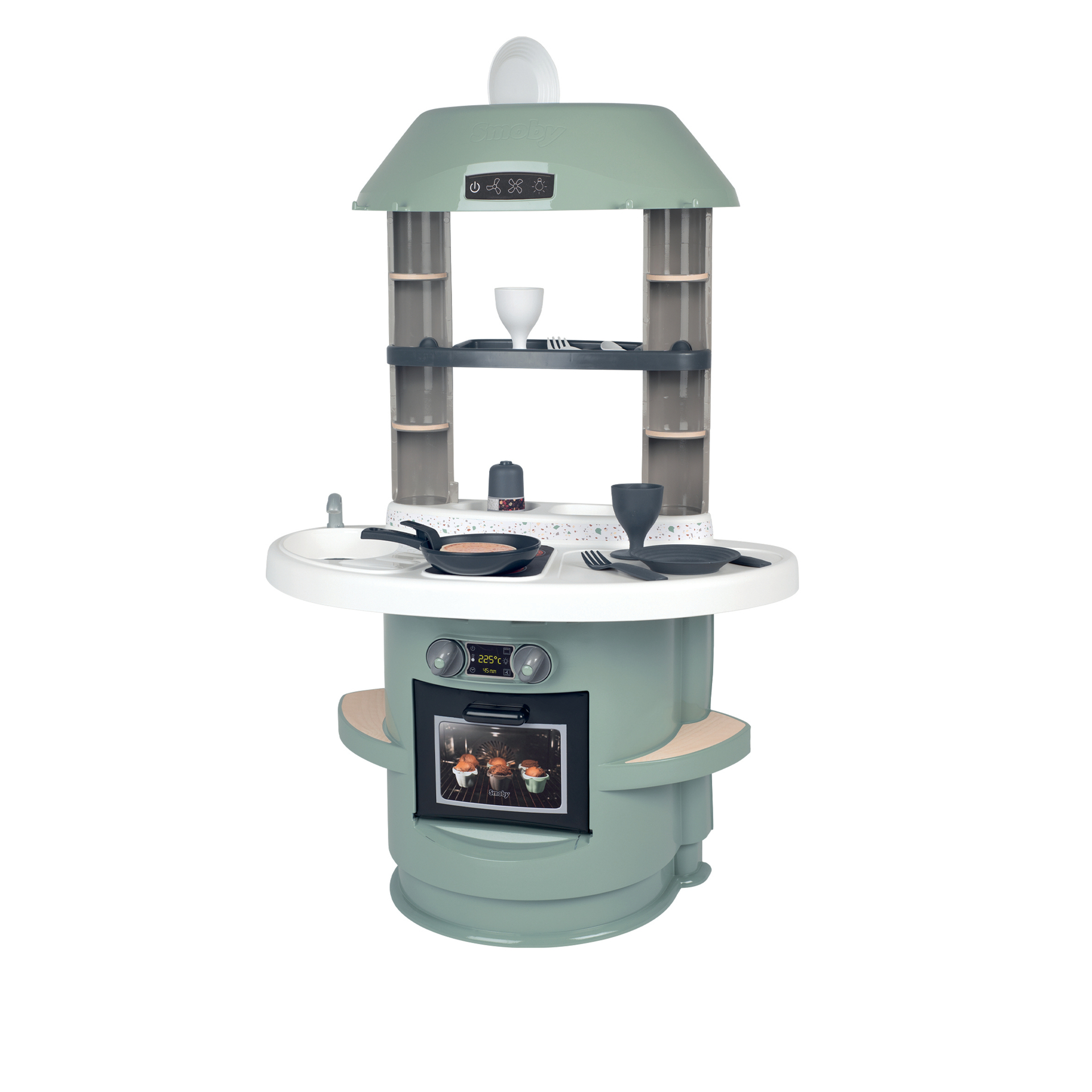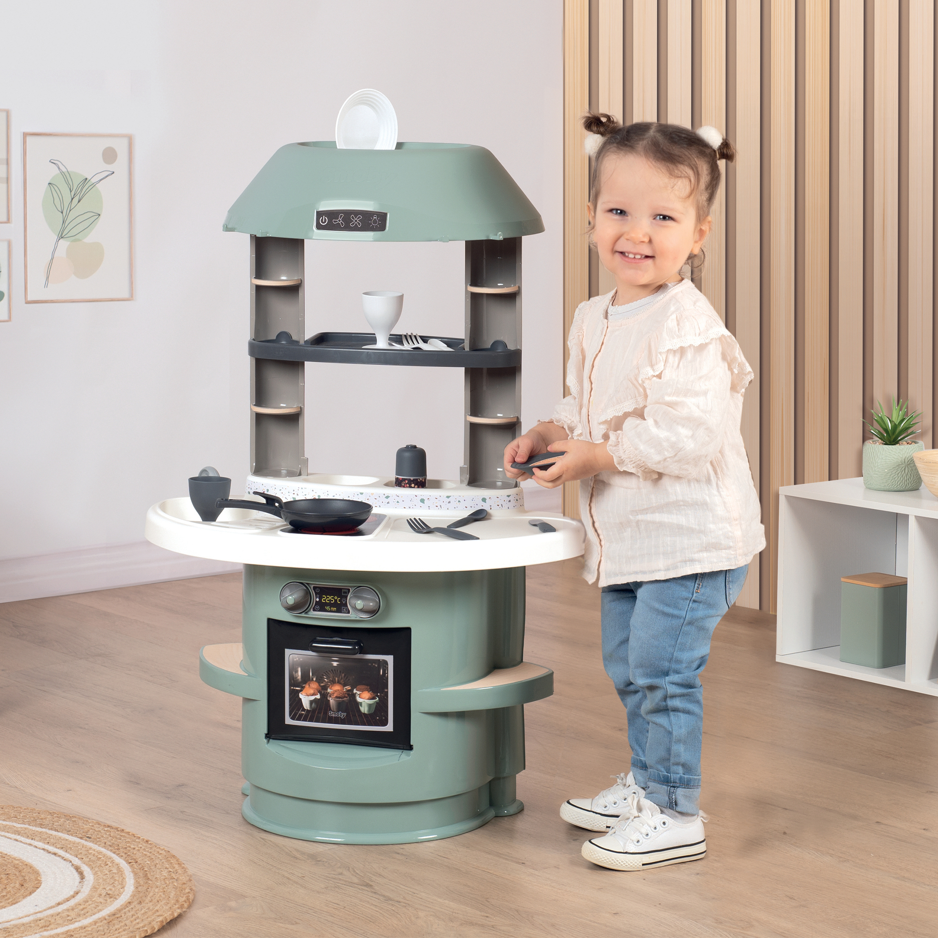 | Plus produit | Cuisine aux couleurs douces et au design épuré. Dispose de plusieurs fonctions de jeu dont plaque de cuisson, four, évier et 13 accessoires inclus. Hauteur plan de travail 36 cm. |
