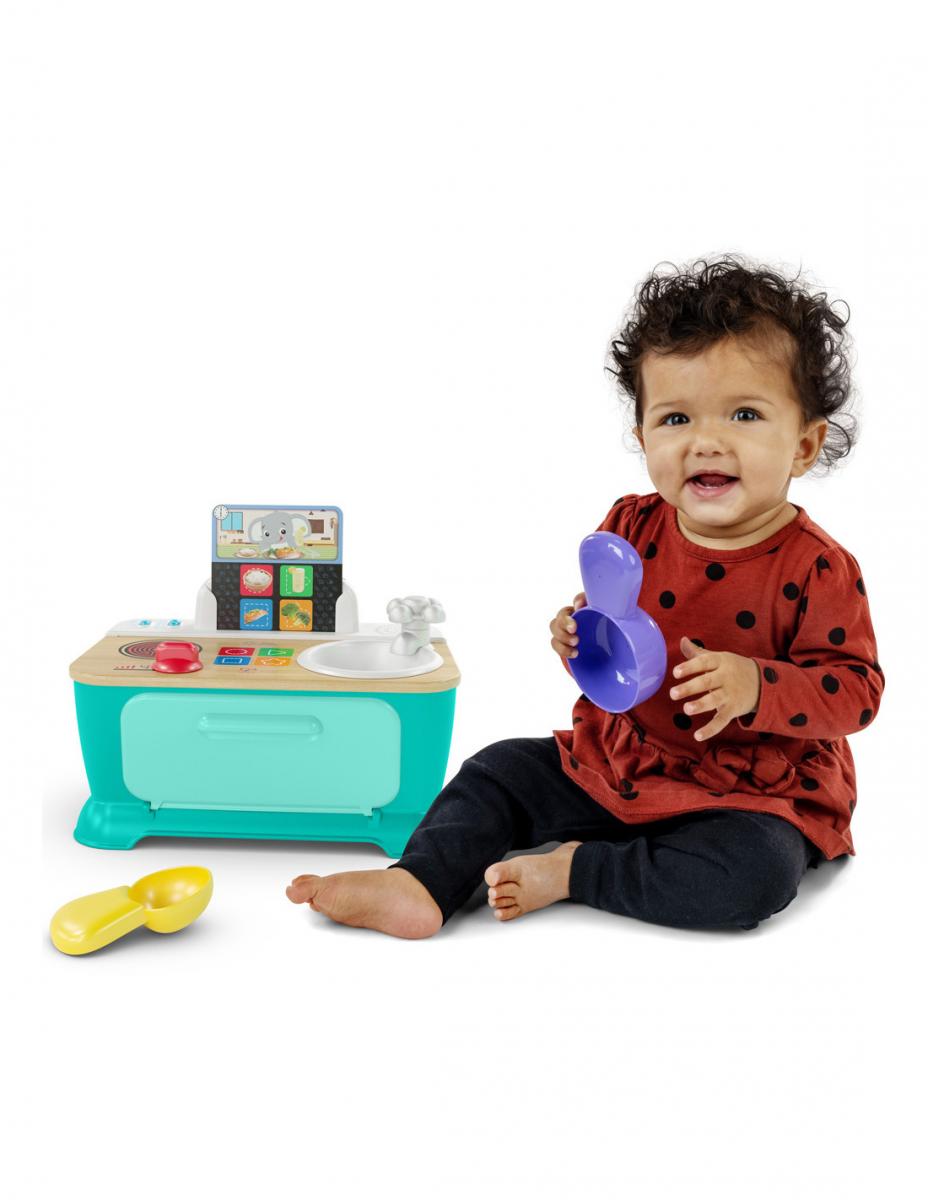 La technologie Magic Touch ™propose des sons familiers de cuisine, ainsi que des lumières, des mélodies et des associations d'aliments. Découvrez la cuisinière Magic Touch, un jouet évolutif et ludique d'imitation pour apprendre et préparer les repas ! MODE BÉBÉ : présente des lumières et des mélodies musicales. MODE DECOUVERTE enseigne 3 repas par jour lorsque les cartes sont insérées (3 cartes recto verso). Lorsque les cartes ne sont pas insérées l’enfant apprend les couleurs et les formes. La plaque de cuisson change de couleur en fonction de la touche choisie. Introduit les concepts de jeu d’imitation d'une manière agréable pour les bébés, avec des modèles de jeu plus avancés lorsque l'enfant grandit. Contenu : 1 cuisinière, 6 menus (3 cartes recto-verso, 1 cuillère, 1 casserole 1. Insérez une carte de recettes pour apprendre des phrases, des sons et des mélodies de cuisine 2. Augmentez le feu pour entendre des grésillements et faire illuminer la cuisinière. 3. Le four s'ouvre pour "cuire" les aliments ou ranger la casserole et la cuillère. 4. Tourner le bouton du robinet pour créer un bruit de manivelle. 5. 4 boutons Magic Touch™ ultra-réactifs réagissent au moindre contact de bébé.