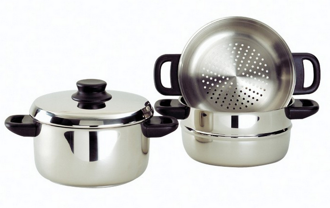 8342640 - cuit vapeur 20cm - Cuit vapeur BAUMALU 8342640.Idéal pour faire cuire vos aliments à la vapeur, il est composé d'un faitout , de deux compartiments perforés ainsi que d'un couvercle en inox.Il possède un triple fond capsulé inox/alu/inox pour une bonne répartition de la chaleur. Les poignées et le bouton du couvercle sont en bakélite. - Matière : Acier inoxydable.