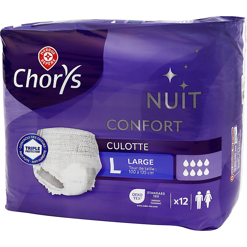 CULOTTE INCONTINENCE LARGE NUIT CHORYS VOILE DE SURFACE (POLYPROPYLÈNE), COUCHE D’ACQUISITION (POLYESTER), CORPS ABSORBANT (CELLULOSE, POLYMÈRE SUPERABSORBANT (POLYACRYLATE DE SODIUM)), ENVELOPPE EXTÉRIEURE (POLYÉTHYLÈNE, POLYPROPYLÈNE, CARBONATE DE CALCIUM), CEINTURE (POLYPROPYLÈNE), BARRIÈRES ANTI-FUITES (POLYPROPYLÈNE), ÉLASTIQUES (ÉLASTHANNE), COLLE (POLYMÈRES THERMOPLASTIQUES, RÉSINE SYNTHÉTIQUE).