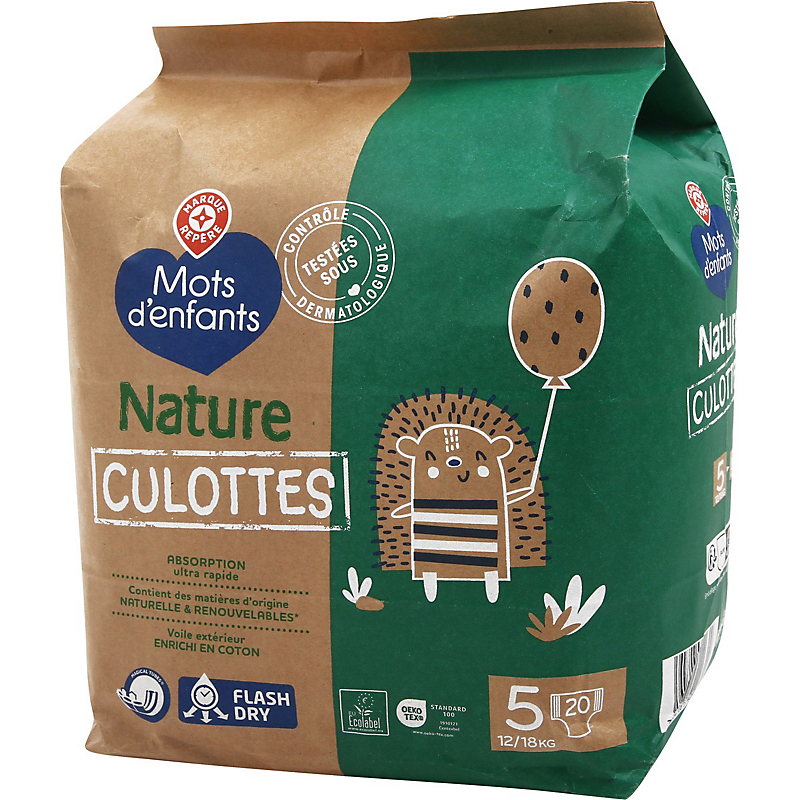 CULOTTE ECOLOGIQUE Mots d’enfants Nature vous propose une gamme de culottes bébé certifiées vous permettant de limiter votre impact sur l’environnement. Votre tout-petit sera protégé tout en douceur et pourra se déplacer librement ! • Voile intérieur : doux et micro-aéré, la peau de bébé respire. • Ceinture ultra flexible : s’ajustant à la morphologie de votre bébé pour un confort optimal. • Voile extérieur : enrichi en coton pour apporter douceur et confort. • Barrières anti-fuites avec double élastiques : moins de pression sur la peau délicate de votre bébé et une protection optimale contre les fuites. • Absorption ultra rapide. Picto 12H : Protection renforcée contre les fuites jusqu’à 12h : La présence de canaux dans le corps absorbant permet une diffusion très rapide du liquide sur toute la culotte formant des barrières protectrices anti-fuites. Technologie Magical Tubes® & Flash Dry : Une absorption ultra efficace ! Une protection renforcée contre les fuites et plus de confort au porter pour des fesses bien au sec ! Picto « Magical tubes®» + « Flash Dry » Testées sous contrôle dermatologique, ces culottes sont élaborées pour minimiser les risques d’allergies et sont adaptées aux peaux sensibles. Les culottes Mots d’Enfants sont certifiées STANDARD 100 par l’institut indépendant OEKO-TEX qui teste la présence de plusieurs centaines de substances nocives. Ecolabel : Le label écologique repose sur le principe d'une approche globale qui prend en considération le cycle de vie du produit à partir des matières premières, de la fabrication, de la distribution, jusqu'à son recyclage (impact environnemental). L'objectif étant de promouvoir l'approvisionnement durables des matières premières, de minimiser la production de déchets, de soutenir des produits de haute performance et de haute qualité.