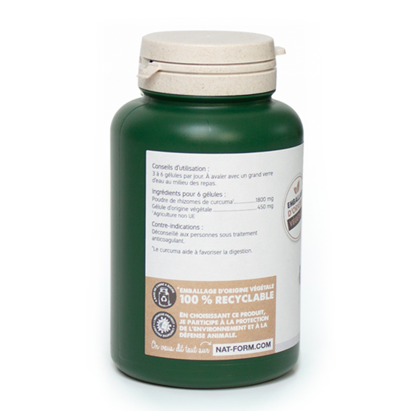 Ingrédients pour 6 gélules : Poudre de rhizomes de curcuma 1800 mg , Gélatine 450 mg