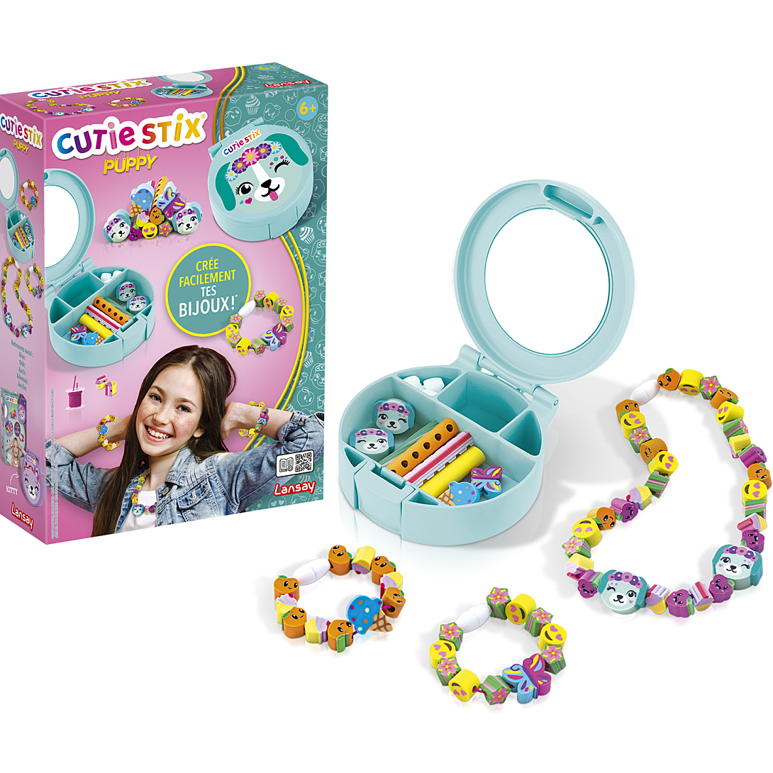 Réalise facilement un collier ou deux bracelets avec ton écrin créatif Cutie Stix PUPPY !Sépare les Moyens Stix, déjà pré-découpés et pré-percés, pour créer tes perles et choisis une perle de Grand Stix pour finaliser ta création !Essaie ton collier ou tes bracelets et regarde-toi dans le miroir !Pratique, tu peux l’emmener partout avec toi. Dès 6 ans.
