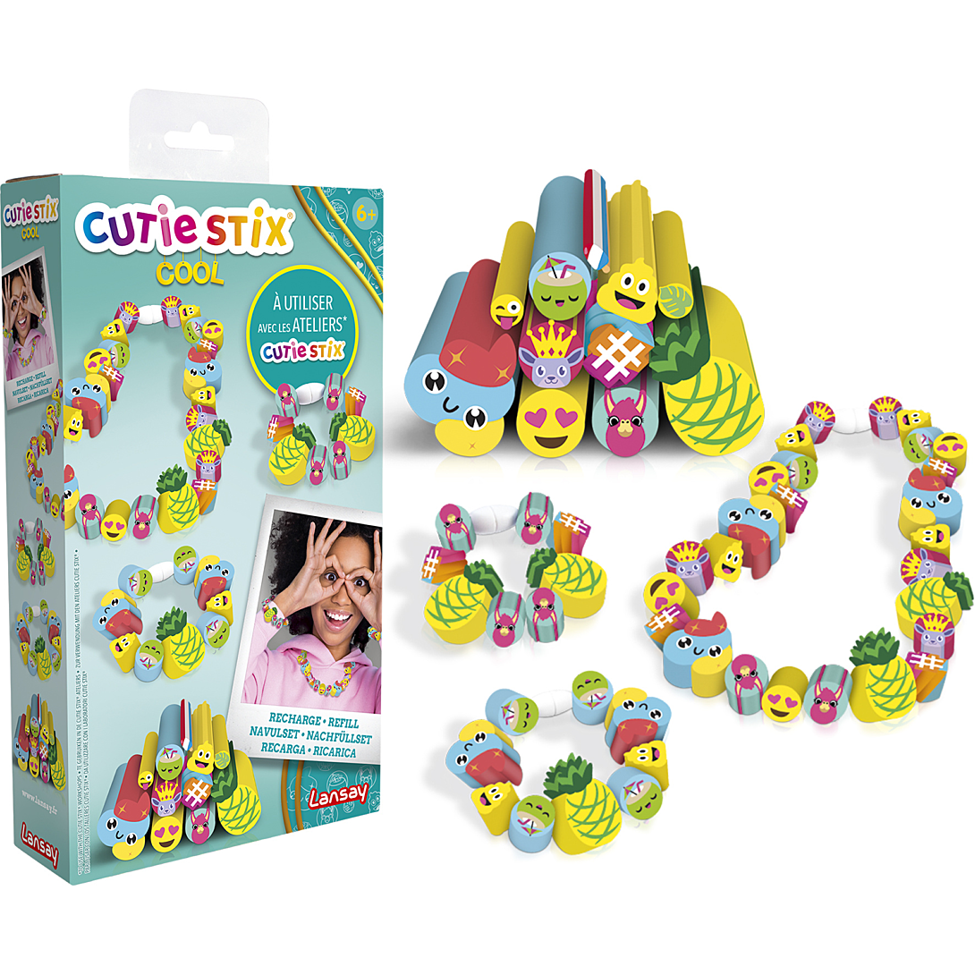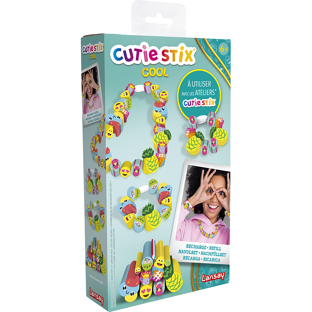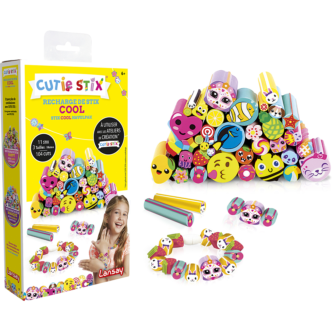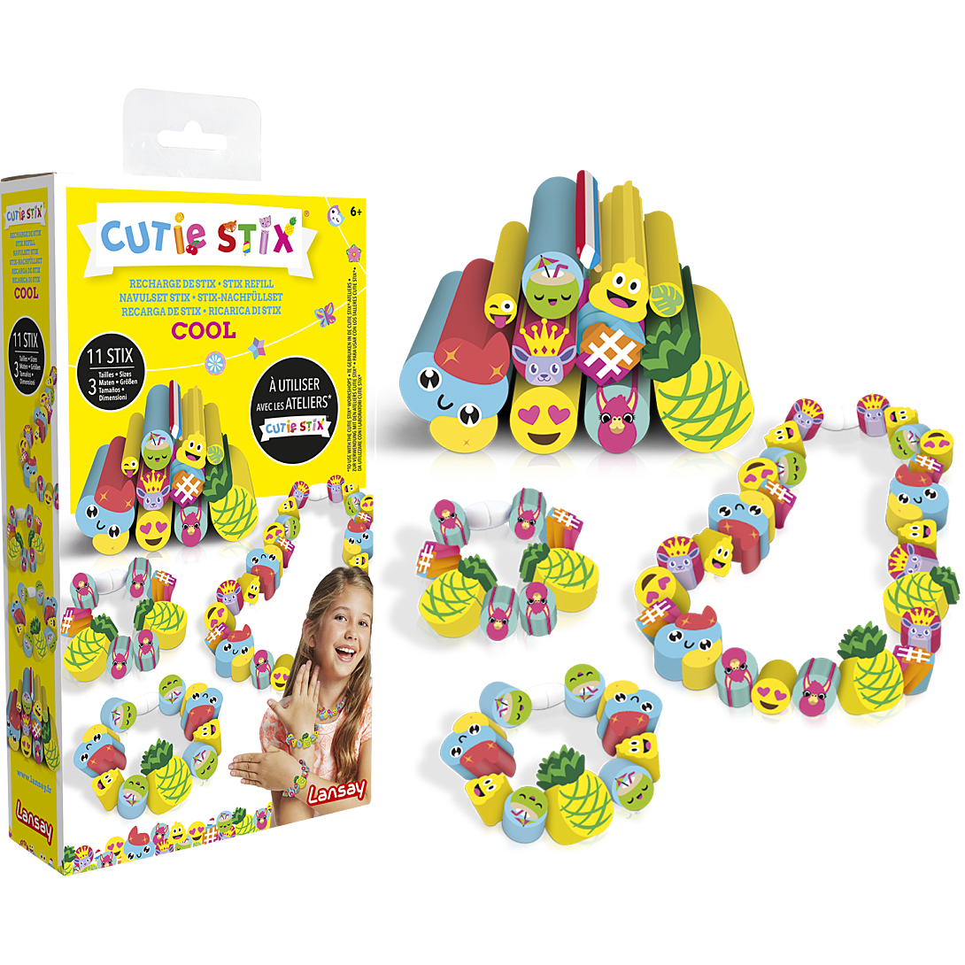 Des Stix trop mignons à découper pour créer des bijoux à l'infini ! Choisis ton Stix, coupe-le puis perce-le. Tu obtiens une petite perle trop mignonne. Super ! Cette recharge sur le thème Cool viendra compléter ta collection : fruits, étoile, animaux... Crée des bijoux trop craquants avec cette recharge ! À utiliser avec les ateliers Cutie Stix. Dès 6 ans