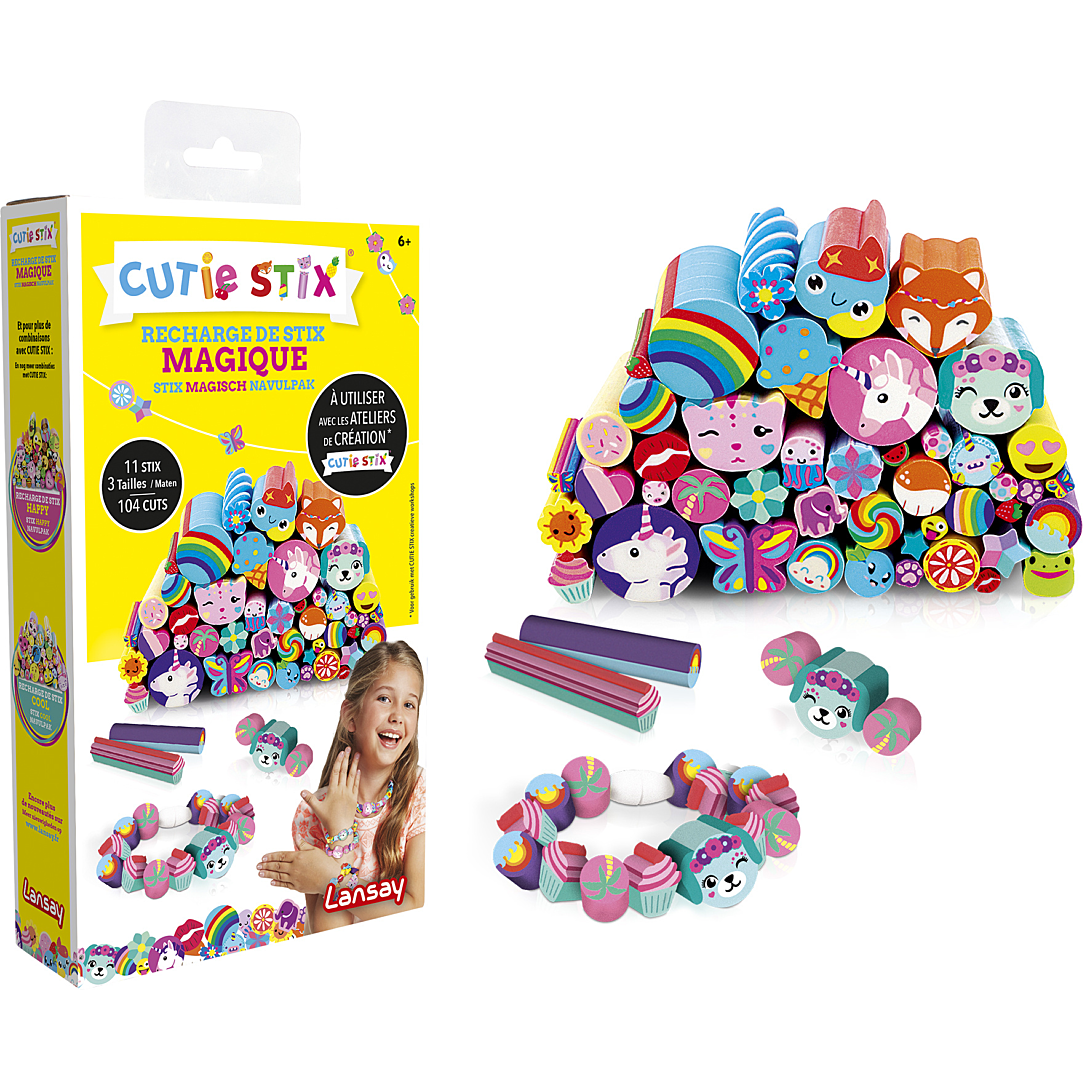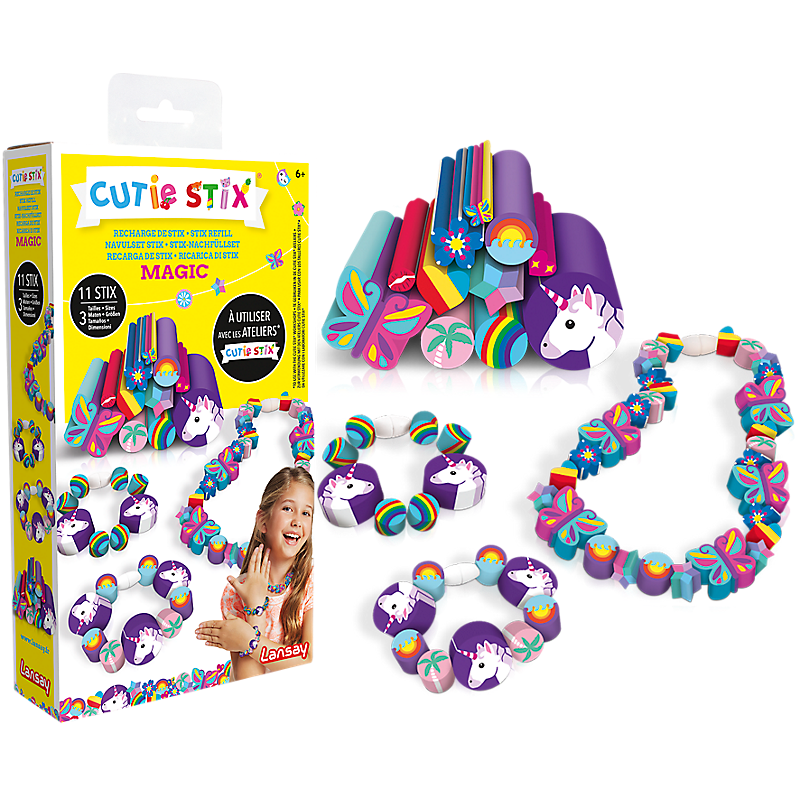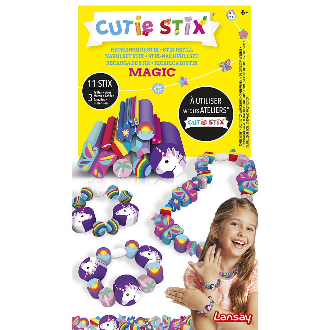 Des Stix trop mignons à découper pour créer des bijoux à l'infini ! Choisis ton Stix, coupe-le puis perce-le. Tu obtiens une petite perle trop mignonne. Super ! Cette recharge sur le thème Magique viendra compléter ta collection : arc en ciel, étoile, licorne... Crée des bijoux trop mignons avec cette recharge ! À utiliser avec les ateliers Cutie Stix. Dès 6 ans