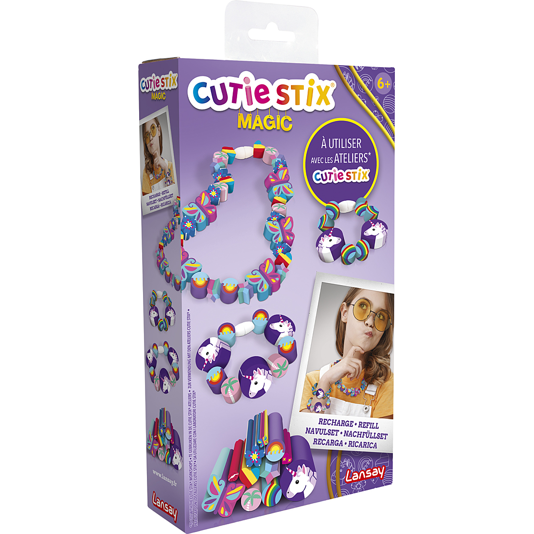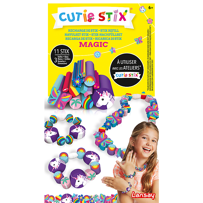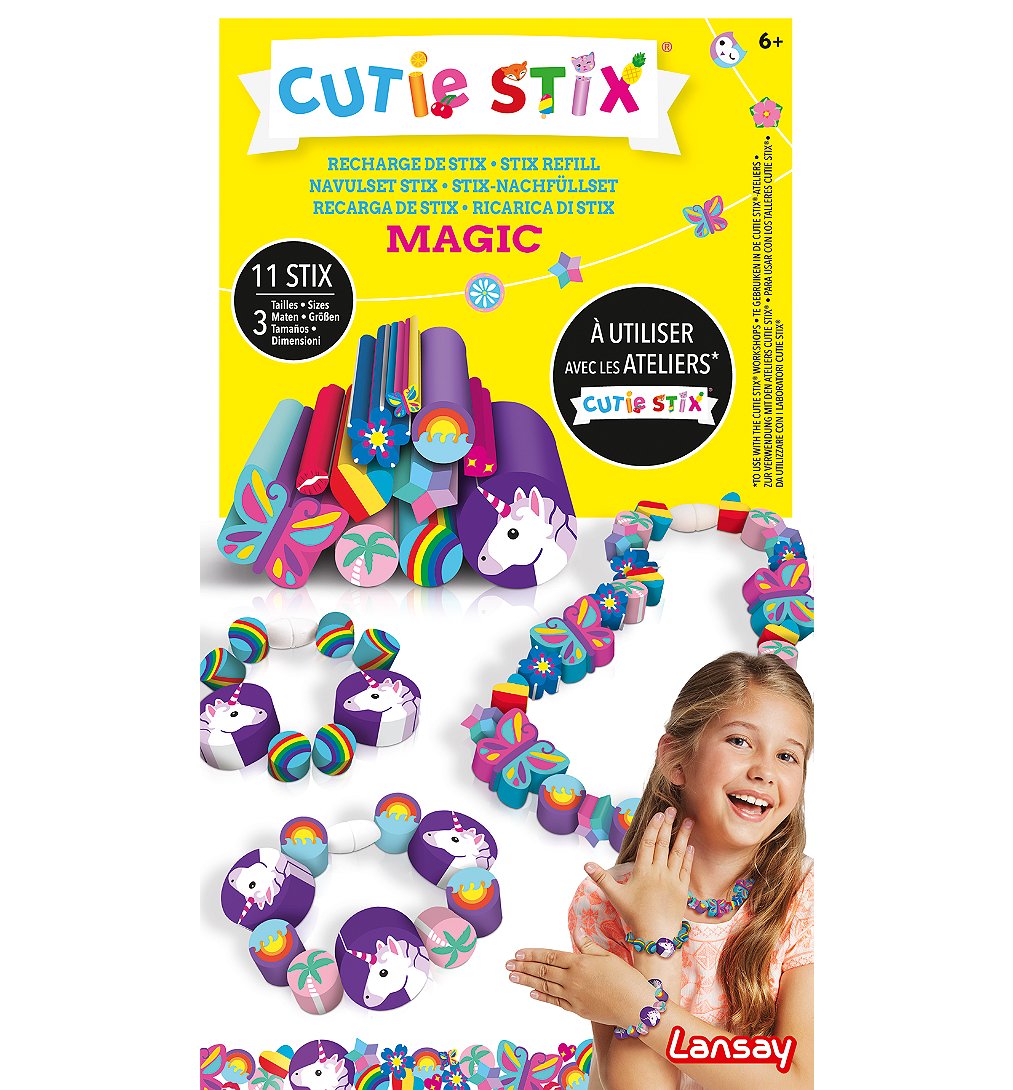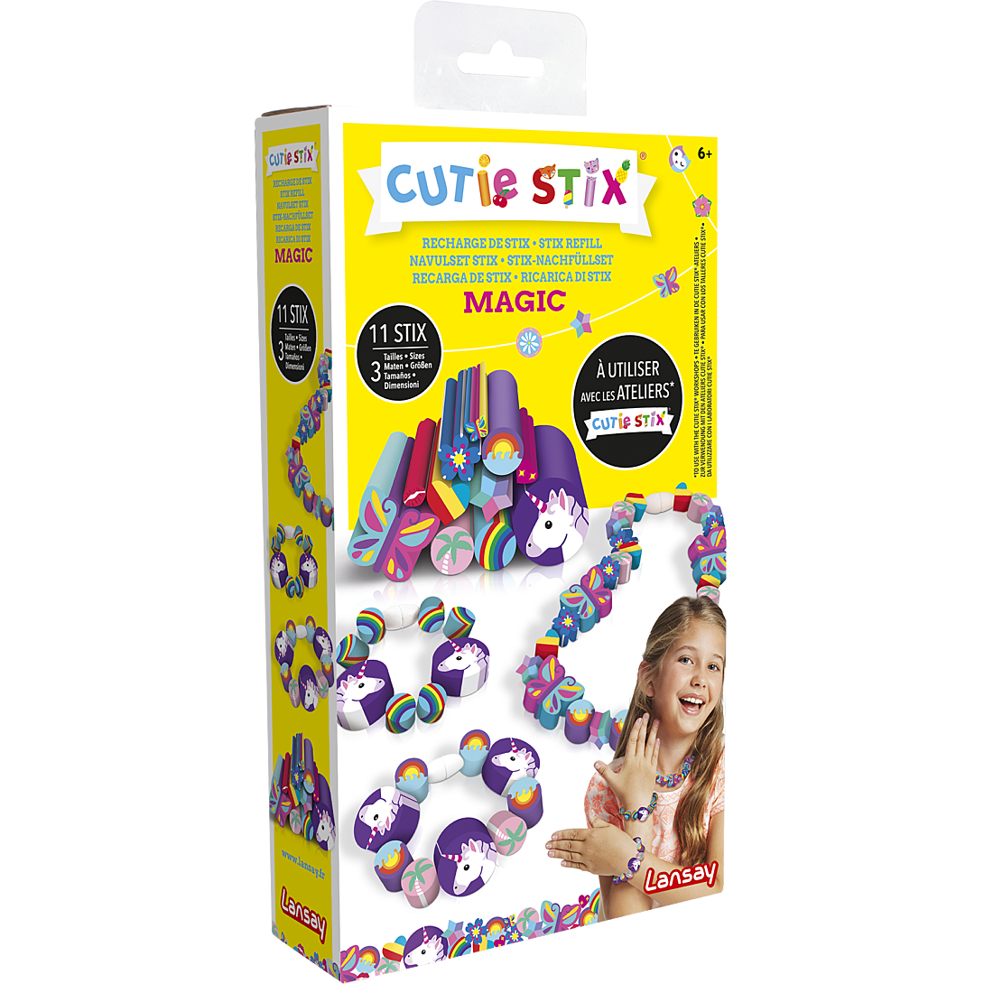 Des Stix trop mignons à découper pour créer des bijoux à l'infini ! Choisis ton Stix, coupe-le puis perce-le. Tu obtiens une petite perle trop mignonne. Super ! Cette recharge sur le thème Magique viendra compléter ta collection : arc en ciel, étoile, licorne... Crée des bijoux trop mignons avec cette recharge ! À utiliser avec les ateliers Cutie Stix. Dès 6 ans