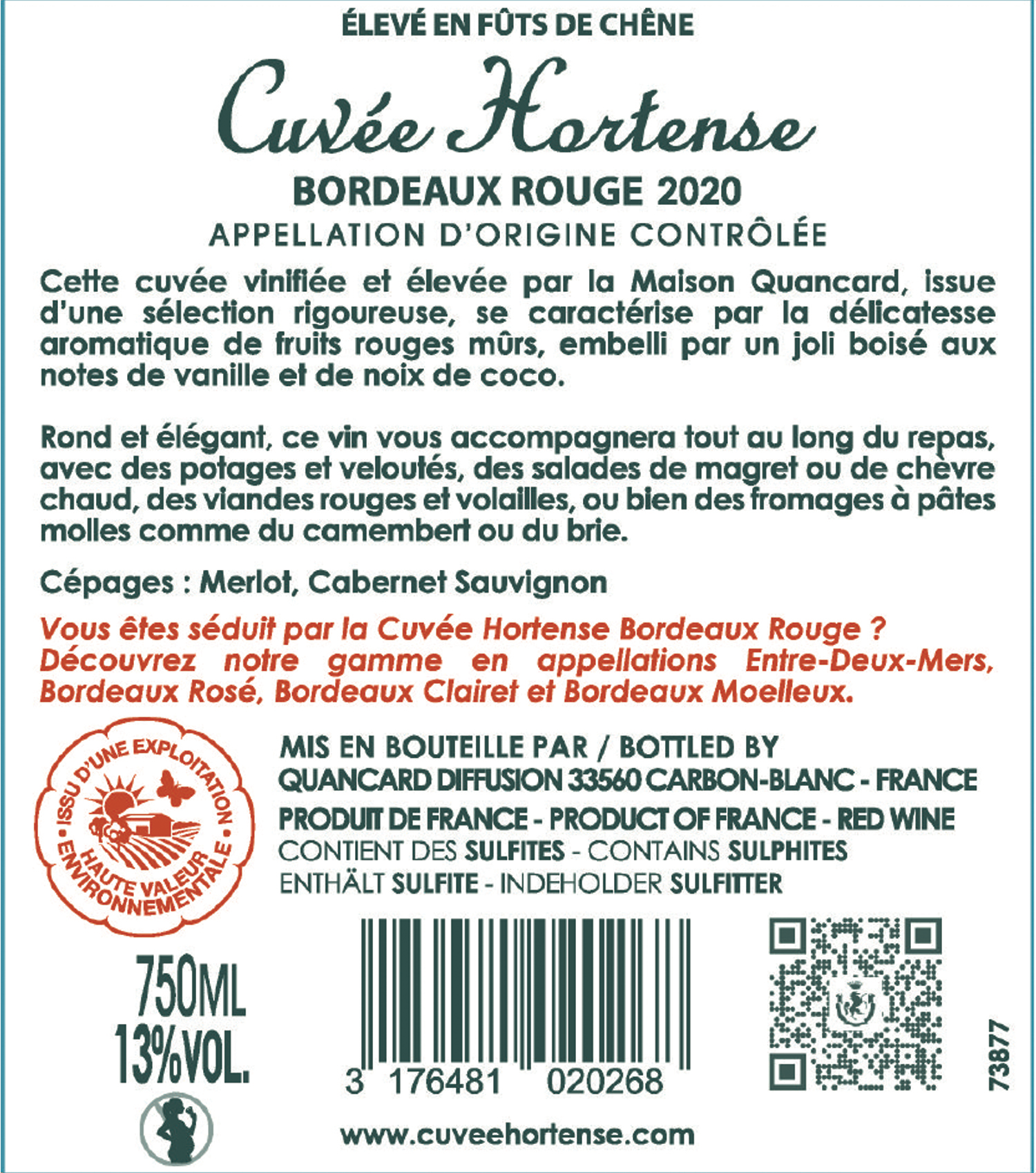| Libellé | Cuvée Hortense, 2020 - Côtes de Bordeaux AOP - Rouge - 75 cl |