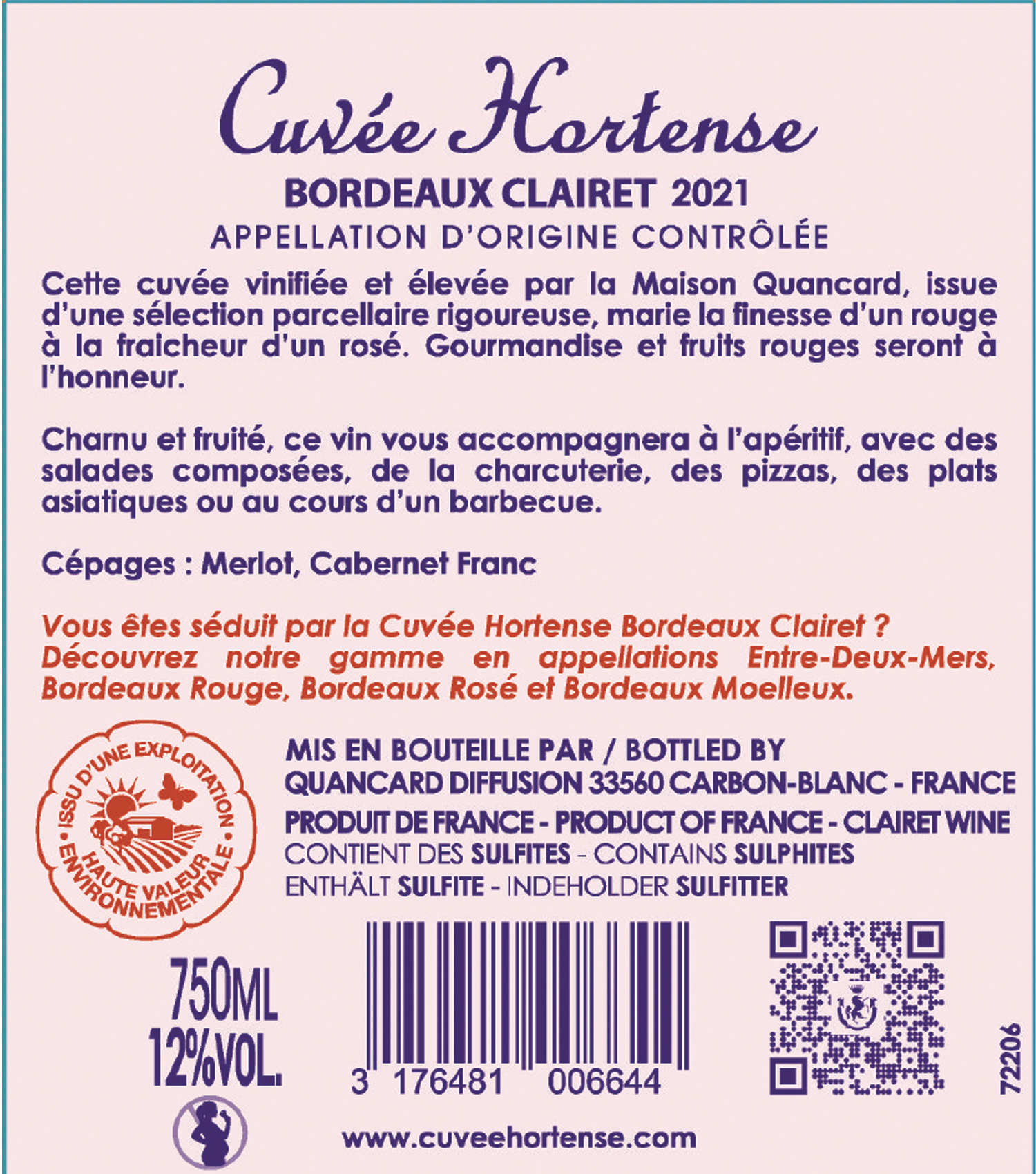| Libellé | Cuvée Hortense Bordeaux Clairet , 2022 - Bordeaux Clairet AOP - Rosé - 75 cl |