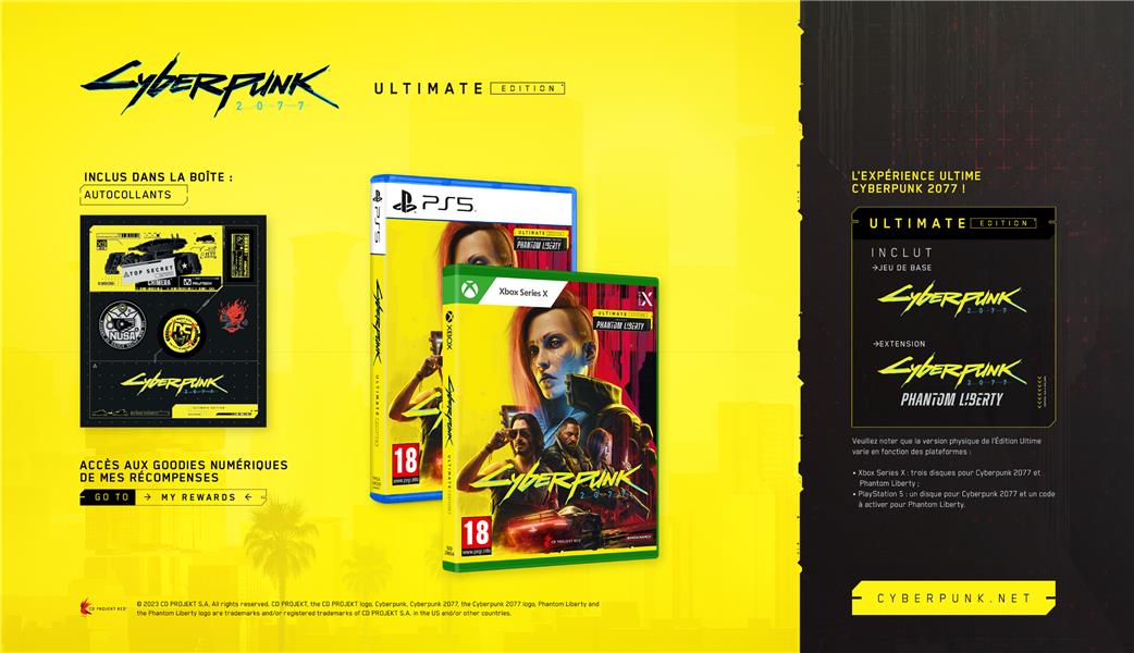 Contenu bonus : Dans l'Édition Ultime, plongez dans chaque histoire que ce monde au futur sombre peut vous offrir, et retrouvez toutes les mises à jour de gameplay et de contenu dans un seul pack, comprenant l'extension à succès façon thriller d'espionnage Phantom Liberty. Cyberpunk 2077 est un RPG d'action-aventure en monde ouvert qui se déroule à Night City, une mégalopole obsédée par le pouvoir, la séduction et les modifications corporelles. Incarnez V, cyber-mercenaire, et affrontez les forces les plus puissantes de la ville dans un combat pour la gloire et la survie. C'est ici que se forgent les légendes. Quelle sera la vôtre ? L'EXPÉRIENCE CYBERPUNK 2077 ULTIME Dans l'Édition Ultime, plongez dans chaque histoire que ce monde au futur sombre peut vous offrir, et retrouvez toutes les mises à jour de gameplay et de contenu dans un seul pack, comprenant l'extension à succès façon thriller d'espionnage Phantom Liberty.