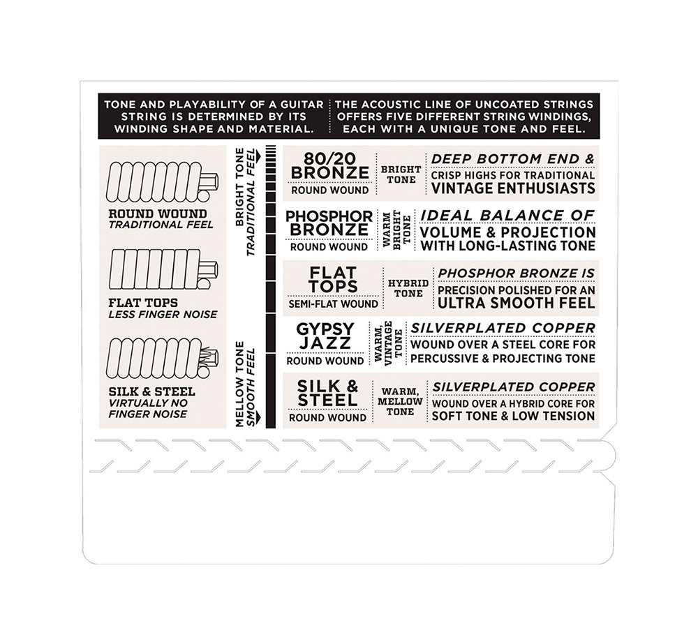 Ces cordes Flat Top sont profilées de façon à réduire le bruit des glissements de doigts sur les cordes. Elles sont idéales pour le picking ou les sessions d'enregistrement.
