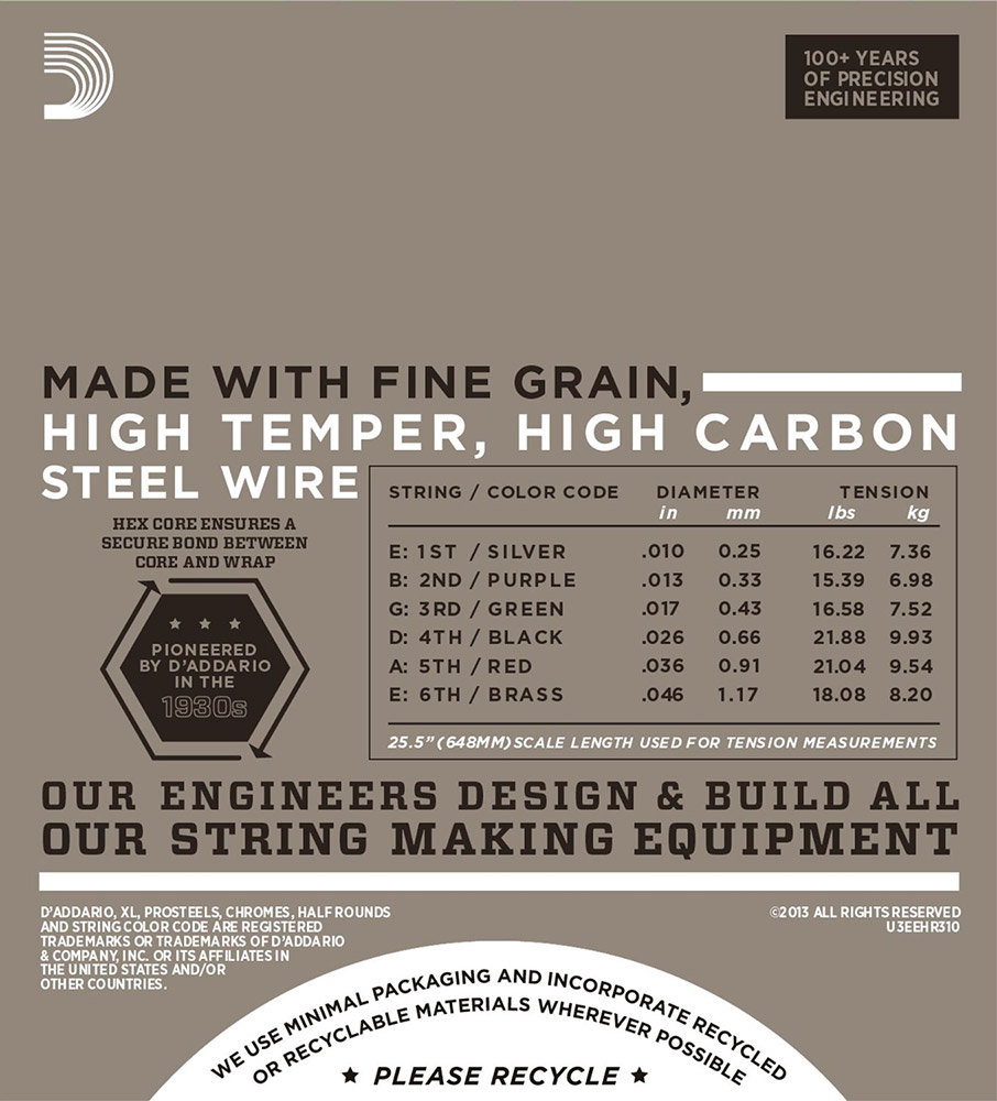 Voici le détail de chaque corde : E 010 (Mi) - B 013 (Si) - G 017 (Sol) - D 026 (Ré) - A 036 (La) - E 046 (Mi).