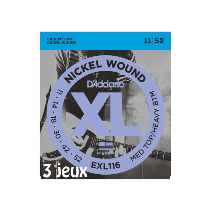 Libellé D'Addario EXL116-3D, filets en nickel, aiguës Medium/graves Heavy, 11-52, 3 jeux - Jeu guitare électrique