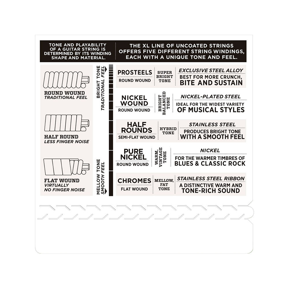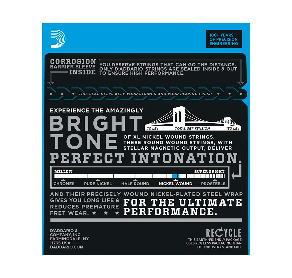 Les cordes EXL150H Nashville Tuning, également appelées High-Strung Tuning, utilisent les cordes d'octave supérieure d'un jeu 12 cordes pour obtenir un son scintillant et « jangly ». Cet accordage est populaire chez les musiciens de studio pour doubler une guitare 6 cordes et obtenir un effet 12 cordes.Les XL filées au nickel, cordes pour guitare électrique les plus populaires de D'Addario, sont faites d'un fil d'acier plaqué nickel filé avec précision autour d'une âme en acier carboné soigneusement usinée. Le résultat : des cordes durables à la tonalité brillante distinctive, à l'intonation excellente, idéales pour un large éventail de guitares et de styles musicaux.