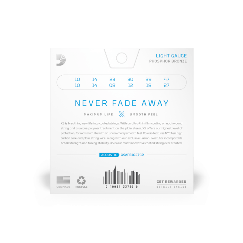Le bronze phosphoreux XS représente un véritable bond en avant pour la technologie des cordes avec revêtement. Constituée de cordes filées avec une couche de revêtement ultrafin et de cordes en acier pur bénéficiant d'un traitement polymère unique, la gamme XS vous fait profiter de notre niveau de protection le plus élevé pour des cordes avec une durée de vie maximale et un confort de jeu surprenant. Les cordes XS et leurs âmes sont fabriquées en acier NY Steel à haute teneur en carbone, et tirent parti de notre processus exclusif de fusion par torsion pour une stabilité d'accordage et une résistance à la casse incomparables. Disponibles en bronze phosphoreux pour les guitares acoustiques 6 et 12 cordes, avec des tirants entre Extra-Light et Medium.
