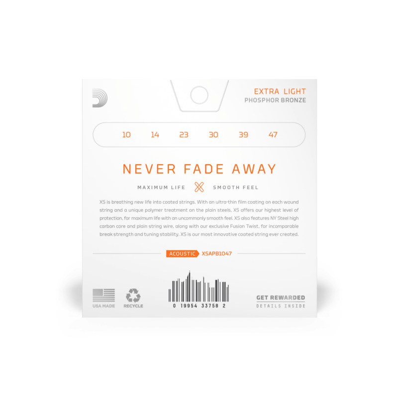 Le bronze phosphoreux XS représente un véritable bond en avant pour la technologie des cordes avec revêtement. Constituée de cordes filées avec une couche de revêtement ultrafin et de cordes en acier pur bénéficiant d'un traitement polymère unique, la gamme XS vous fait profiter de notre niveau de protection le plus élevé pour des cordes avec une durée de vie maximale et un confort de jeu surprenant. Les cordes XS et leurs âmes sont fabriquées en acier NY Steel à haute teneur en carbone, et tirent parti de notre processus exclusif de fusion par torsion pour une stabilité d'accordage et une résistance à la casse incomparables. Disponibles en bronze phosphoreux pour les guitares acoustiques 6 et 12 cordes, avec des tirants entre Extra-Light et Medium.