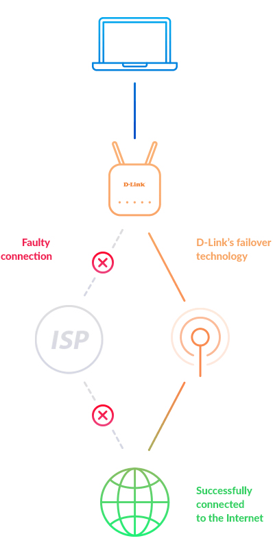 Lorsque votre réseau 5G/LTE cesse de fonctionner, vous restez connecté à votre réseau fixe (fibre, câble, DSL) grâce à la technologie de basculement de D-Link.