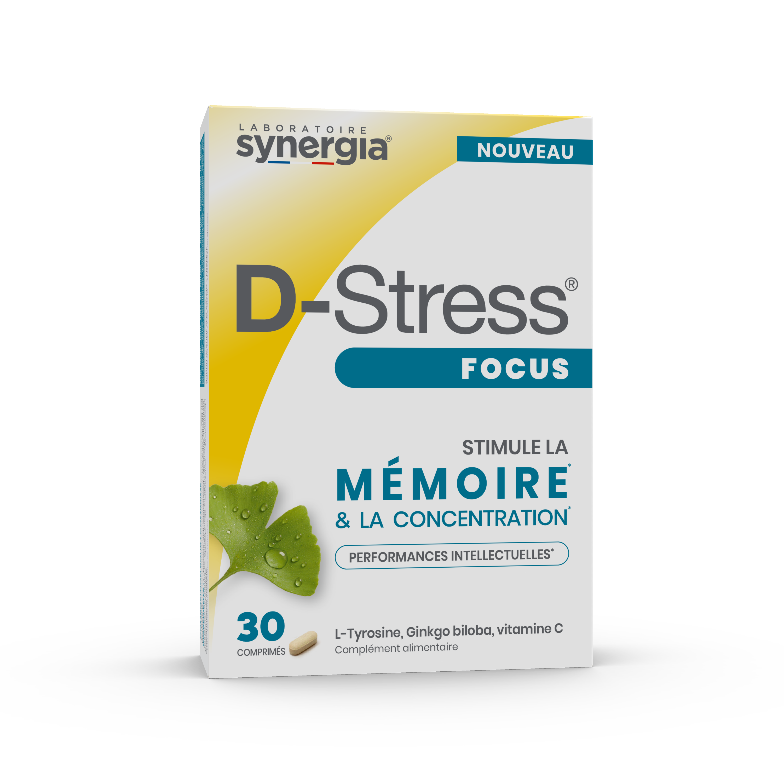 D-Stress Focus est un complément alimentaire des Laboratoires Synergia, à base de L-Tyrosine, Ginkgo biloba, Vitamine C pour stimuler la mémoire et la concentration. Les fonctions cognitives sont continuellement sollicitées. Dans certaines situations, elles ont besoin d’être soutenues : révisions, examens, journées intellectuellement intenses, travail de nuit, décalage horaire, altérations de la mémoire dues à l’âge, compétitions sportives… Il vous permet de faire face aux situations de sollicitation de la mémoire, de la concentration et de l’attention, lors d’efforts intellectuels. Il agira dès le premier comprimé, pris le matin du jour J à jeun !