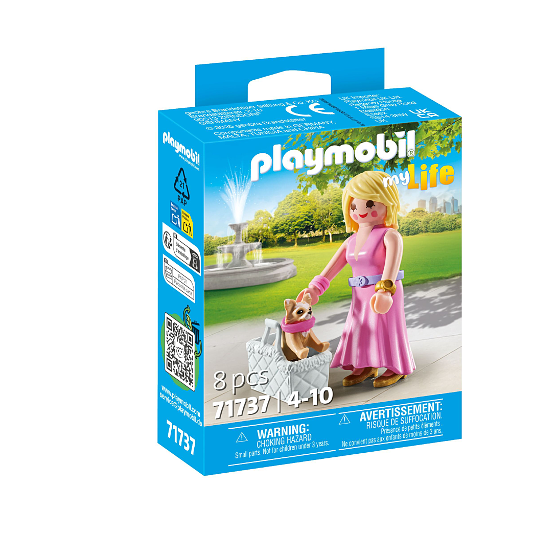 Personnage : 1 femme Animaux : 1 chihuahua Accessoires : 1 sac, 1 montre, 3 bracelets en silicone, 1 collier de chien.