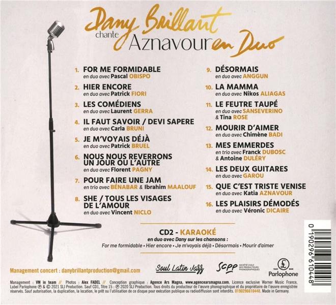 UN ALBUM ÉVENEMENT EN DUO AVEC LES PLUS GRANDS ARTISTES DE LA SCÈNE MUSICALE FRANÇAISE. Après le succès de son premier hommage à Charles Aznavour certifié DISQUE D'OR, Dany Brillant s'est entouré d'artistes chanteurs, acteurs et amis pour reprendre de nouveaux classiques du répertoire de son maître dans un album époustouflant. L'artiste présente un album dans lequel il a su réunir les grands noms de la chanson française partageant la même admiration pour l'oeuvre d'Aznavour tels que Pascal Obispo, Florent Pagny, Patrick Bruel, Patrick Fiori et des invités prestigieux comme Laurent Gerra, Franck Dubosc, Carla Bruni et bien d'autres encore.
