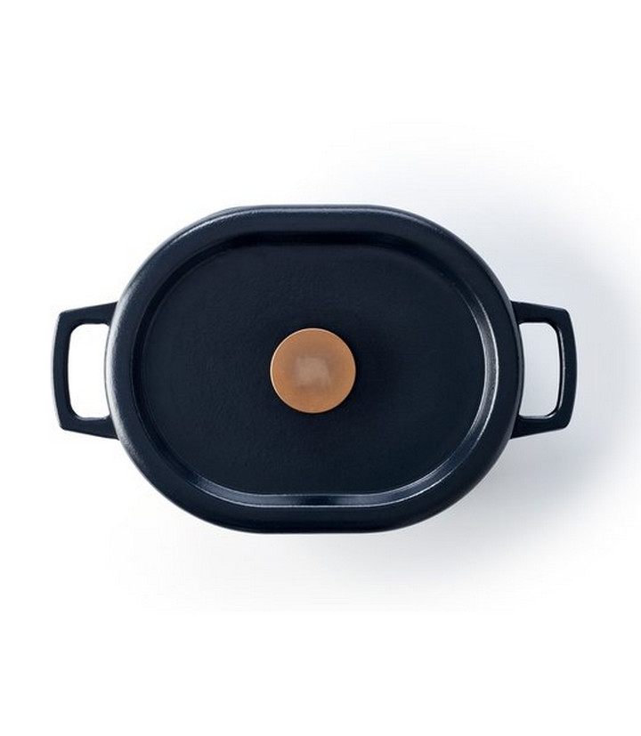 15141314 - daubière en fonte émaillée 31cm noir - Daubière Nori Beka 15141314 en fonte émaillée avec triple fonte émaillée intérieur et extérieur : bonne répartition de la chaleur. Cette cocotte en fonte avec bouton de couleur bronze ne passera pas inaperçue dans votre cuisine et sur votre table. La fonte est un matériau durable, qui diffuse et préserve la chaleur de façon optimale. Cette forme rovale unique (ni ronde ni ovale) offre une capacité allant jusqu'à 5,5 litres. La fonte émaillée est directement prête à l'emploi. Elle est parfaite pour dorer, mijoter, caraméliser et idéale pour cuire au four. La finition épaisse en émail résiste aux rayures et facilite grandement le nettoyage et l'entretien de la cocotte. Le fond permet d'éviter les rayures sur votre plaque de cuisson et votre plan de travail. Grâce aux picots sous le couvercle, le jus de cuisson qui s'évapore est récupéré de manière optimale pour se répartir uniformément sur les aliments. Cet arrosage naturel et continu, permet aux viandes de rester tendres, aux légumes de garder leur moelleux et les saveurs sont préservées.
