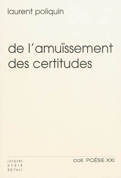 Laurent Poliquin, dans son recueil De l'amuïssement des certitudes, présente sa quête dans laquelle il cherche à structurer sa souveraineté et son opposition à l'asservissement quotidien. C'est dans la musicalité des mots et une certaine sensualité qu'il engage un combat contre la pesanteur de l'existence. Ainsi, les défis cinglants face à la mort, l'aliénation contemporaine, la brume des incertitudes s'atomisent dans ces poèmes épurés, fougueux et sans contredit : amoureux.