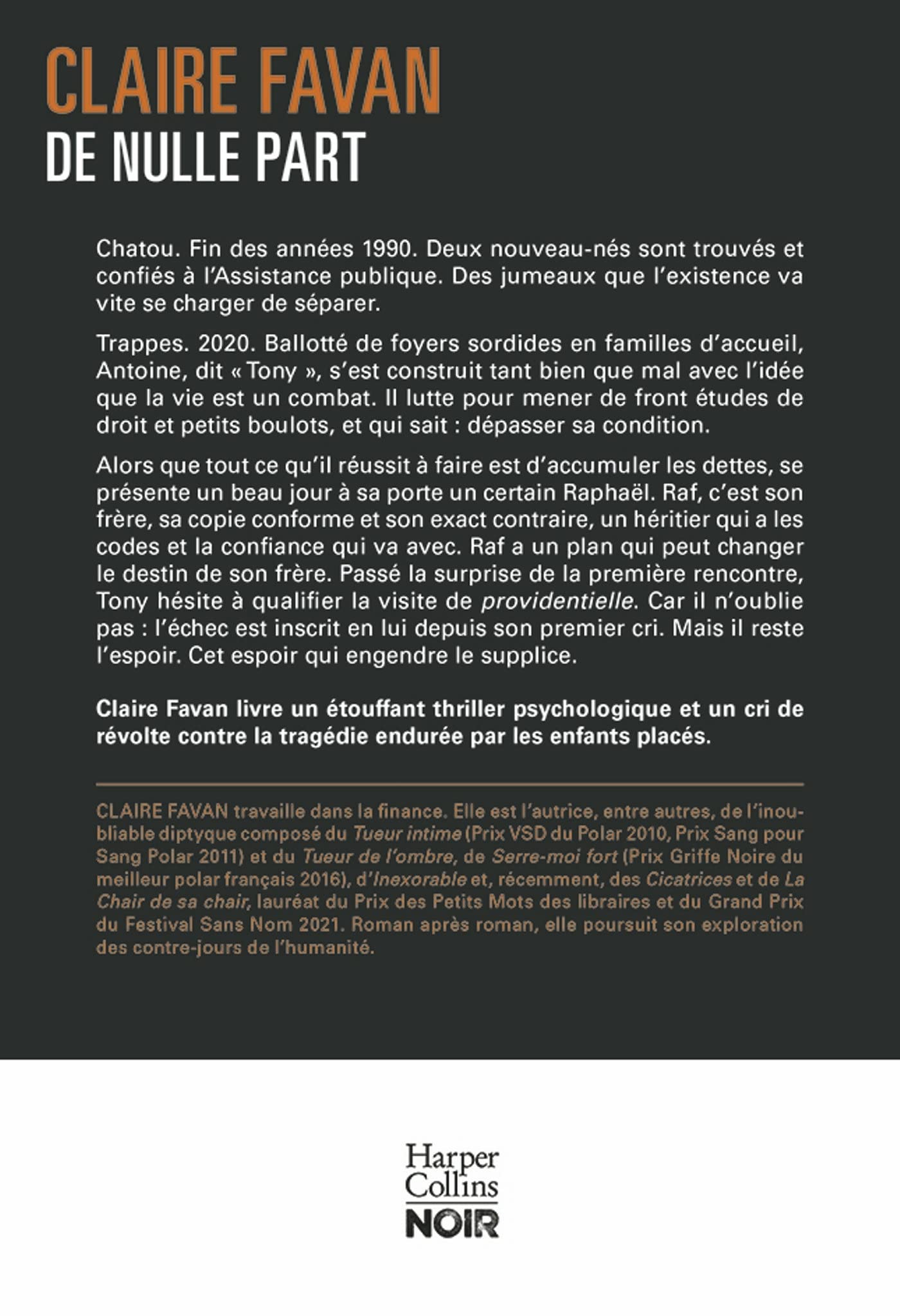 Claire Favan travaille dans la finance. Elle est l’autrice, entre autres, de l’inoubliable diptyque composé du Tueur intime (Prix VSD du Polar 2010, Prix Sang pour Sang Polar 2011) et du Tueur de l’ombre, de Serre-moi fort (Prix Griffe Noire du meilleur polar français 2016), de La Chair de sa chair (lauréat du Prix des Petits Mots des libraires et du Grand Prix du Festival Sans Nom 2021) et, récemment, de De nulle part, distingué par le Grand Prix du salon Noir Charbon 2022. Roman après roman, elle poursuit son exploration des contre-jours de l'humanité.