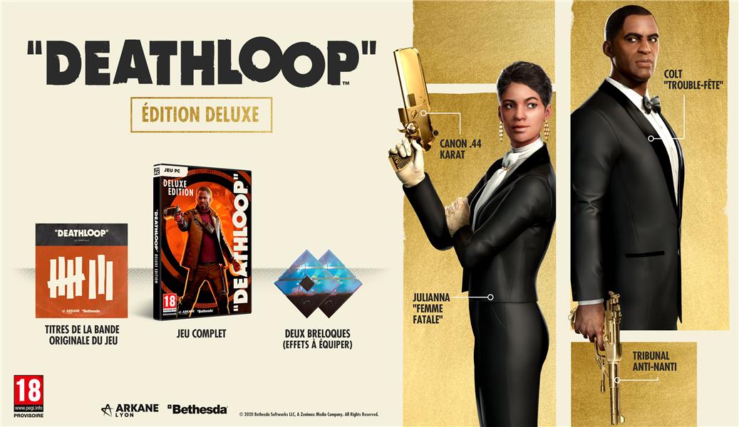 Contenu bonus : Apparence de personnage \"Trouble-Fête\" pour Colt Apparence de personnage \"Femme fatale\" pour Julianna rme unique Tribunal Anti-nanti Arme unique Canon .44 karat Titres de la bande originale du jeu Deux breloques (effets à équiper en jeu) DEATHLOOP est un jeu de tir à la première personne innovant qui sortira sur PlayStation 5 et PC. Le jeu est créé par le studio Arkane Lyon qui a été récompensé à de nombreuses reprises pour la franchise Dishonored. DEATHLOOP plonge le joueur dans une chasse à l'homme frénétique dans lequel les joueurs pourront s'amuser avec les règles et les styles de jeux. A l'instar de Colt, les joueurs sont piégés dans une boucle temporelle sur la mystérieuse île de Blackreef et condamnés à revivre la même journée à l'infini. La seule façon de s'en échapper est de briser la boucle en assassinant huit cibles clés avant que la journée ne recommence.