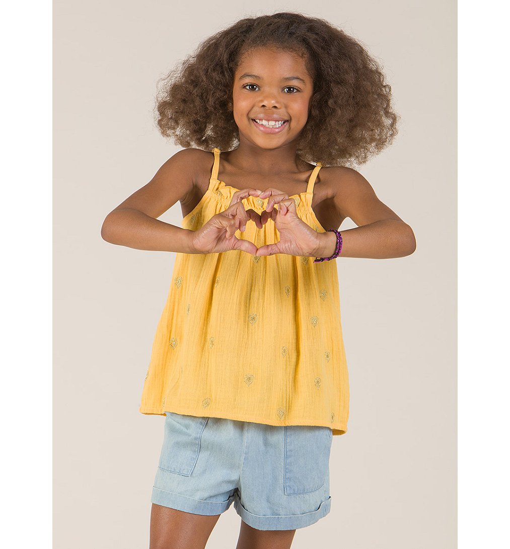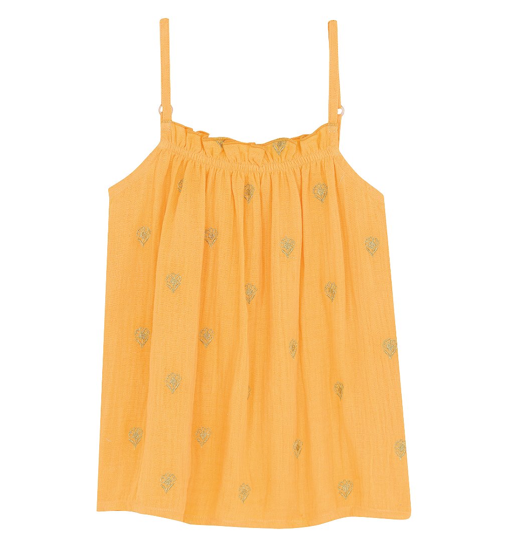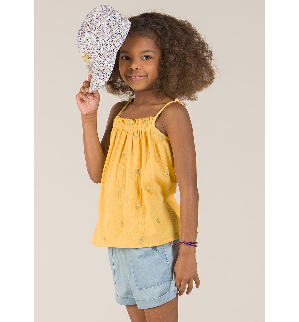Débardeur à fines bretelles fille en gaze de coton. Détails de fronces à l'encolure et motifs brodés en fil doré. Bretelles réglables.