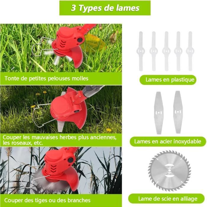 🍃Coupe efficace et sûre: Moteur en cuivre pur, interrupteur à double commande. 2 batteries pour votre utilisation continue. 🍃Conception optimale: Ajouter 2 roues détachables, plus pratique. Tête Pivotante 90° pour passer sous les obstacles. La poignée réglable et la perche télescopique est réglable entre 90-120cm 🍃3 Type de lames: 4 lames métalliques, 2 lames de scie circulaire et des lames en plastique