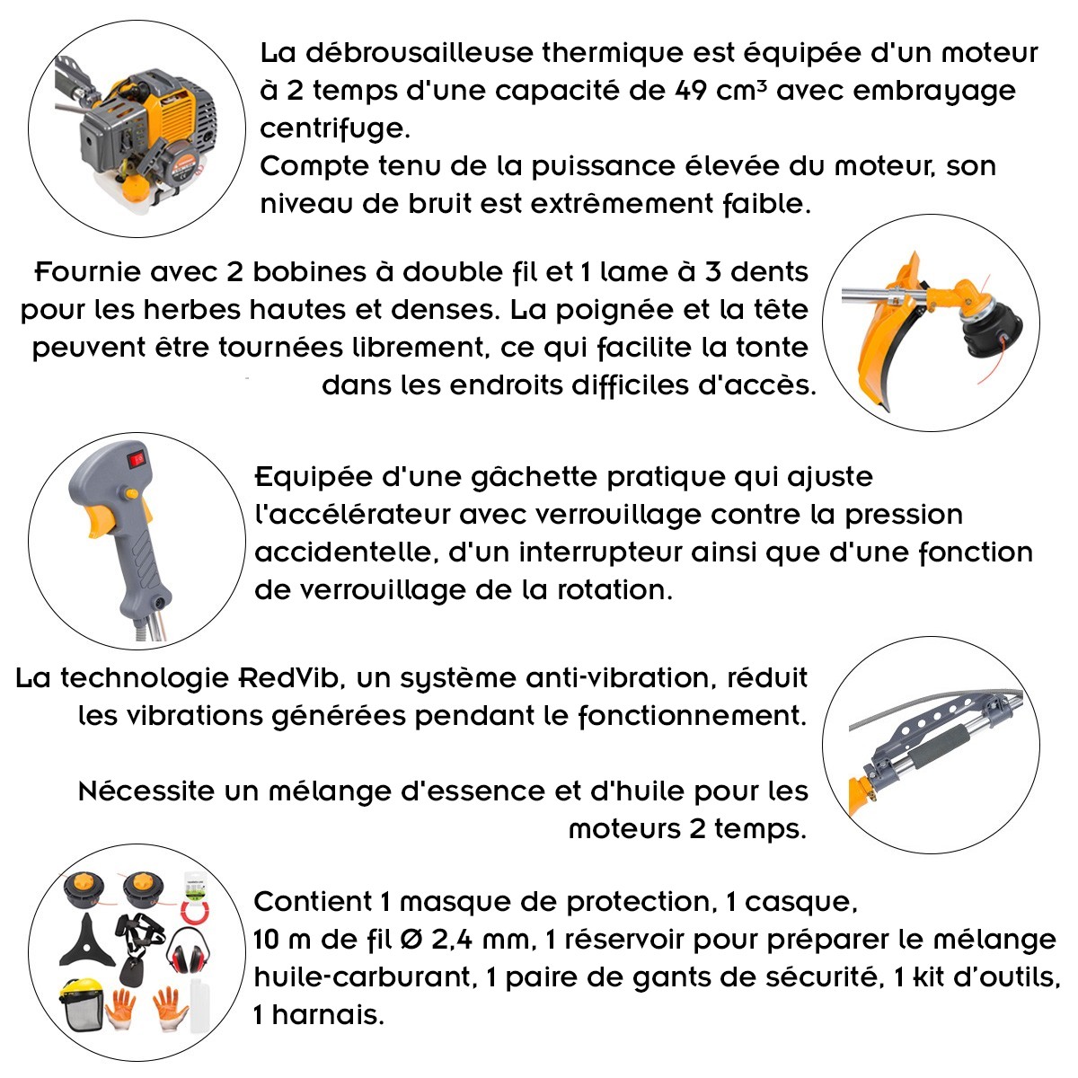 | Libellé | Débroussailleuse thermique avec moteur 2 temps 49 cm³ 6 CV effectif + kit d'accessoires |