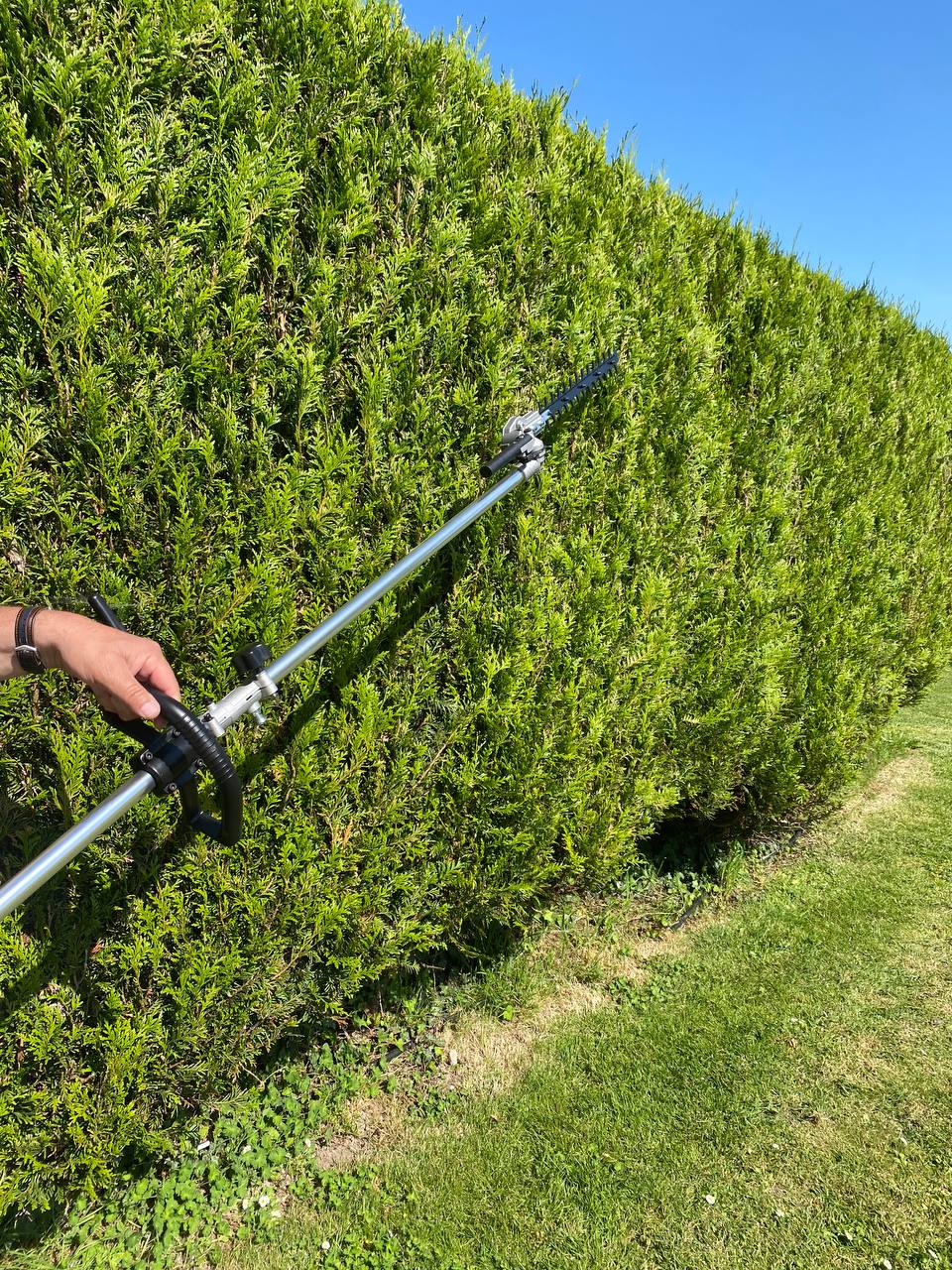 Partie taille-haies: une lame double denture de 40cm, double de taille avec la rallonge.