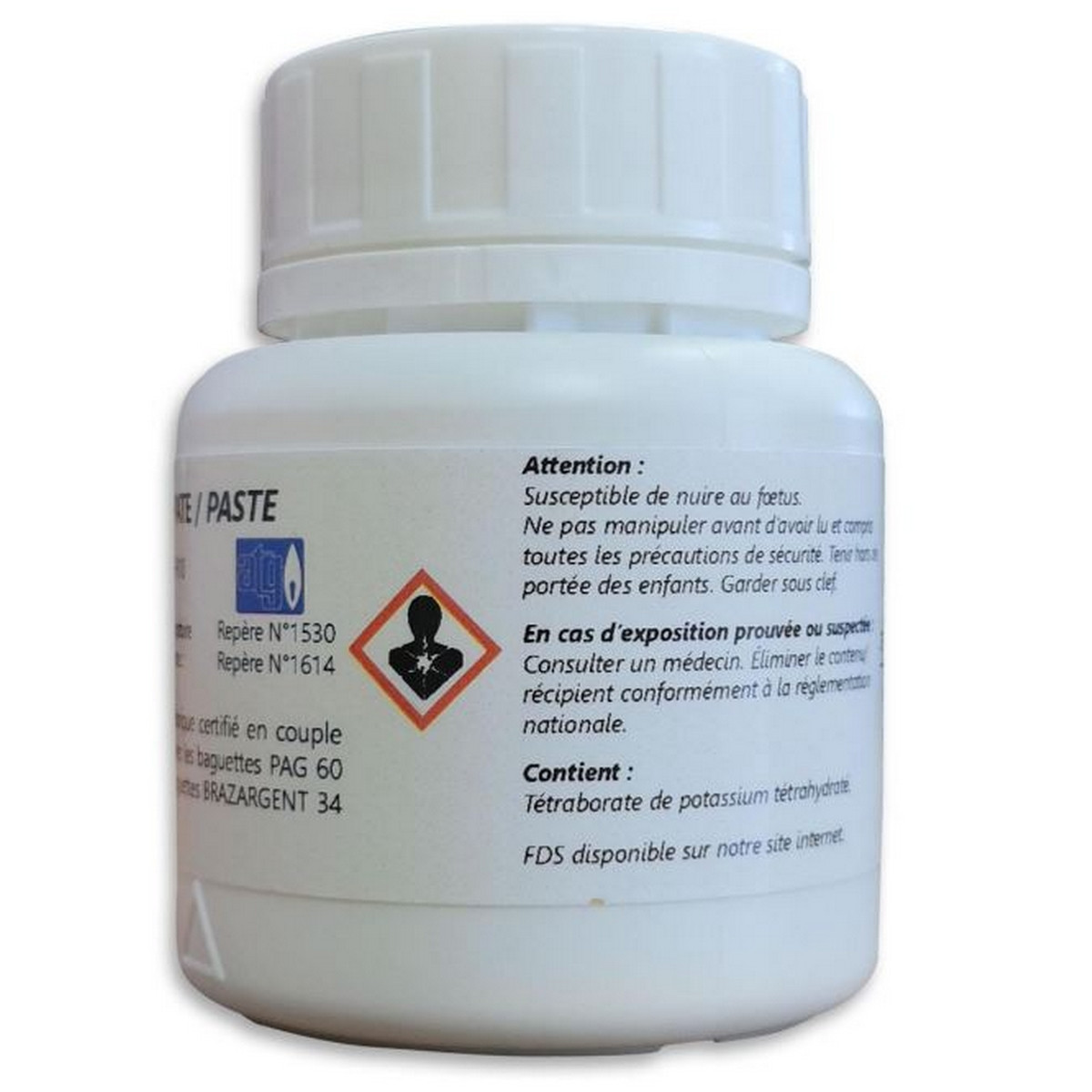 L'utilisation d'un flux décapant est donc vivement recommandée pour toutes les interventions de brasage et de soudo-brasage. Ce produit est homologué pour les installations de gaz combustible. Certifié en couple avec la brasure BRAZARGENT 34 GAZ sous le repère d'enregistrement ATG : n 1614 et la brasure PAG 60 sous le repère d'enregistrement ATG n 1530.| EAN | 3701524004297 |