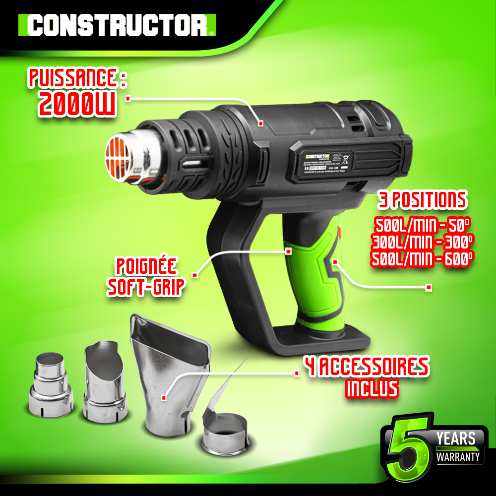 Libellé Décapeur thermique 2000W livré en coffret avec 4 accessoires - Constructor