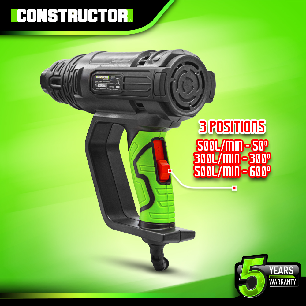 Grâce à ce décapeur thermique de la marque Constructor, vous pourrez facilement décoller des autocollants, appliquer des gaines thermo rétractables, enlever de vieilles peintures, plier des tuyaux plastiques?