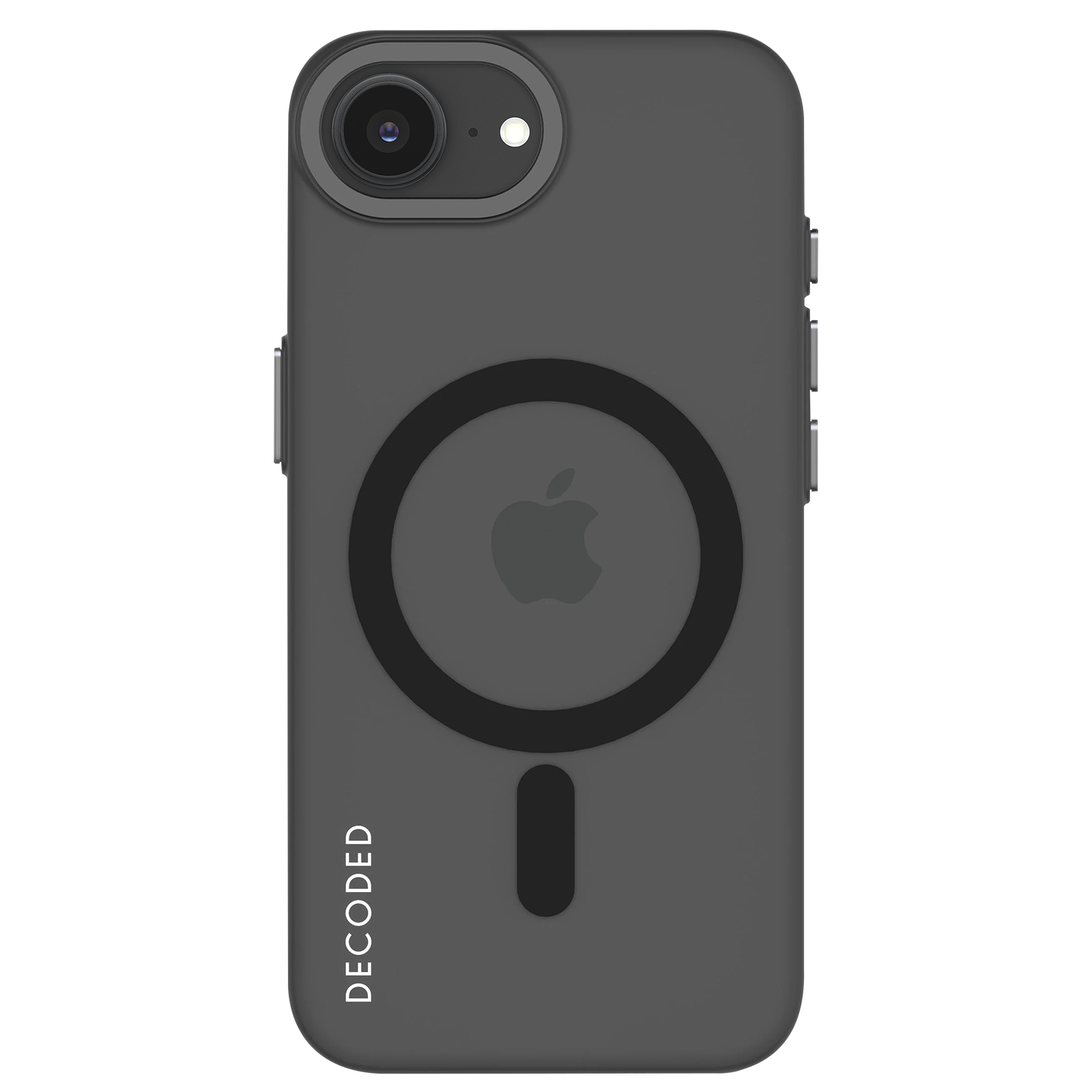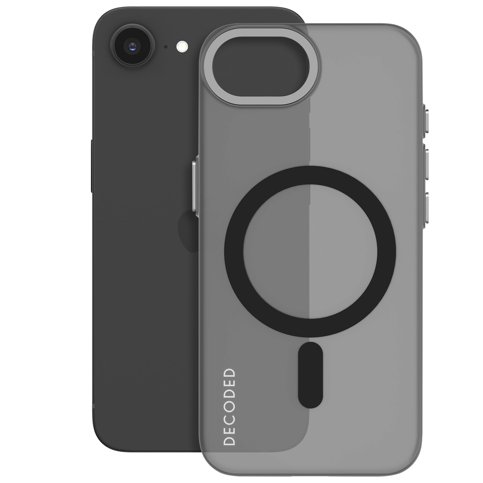 Coque Decoded pour iPhone 16e Gris Translucide. Résistante aux chutes jusqu'à 1,2m. Compatible MagSafe. Technologie Biomaster anti-microbes. Design haut de gamme en silicone mat et soft touch. Accès complet aux ports. Emballage écologique.