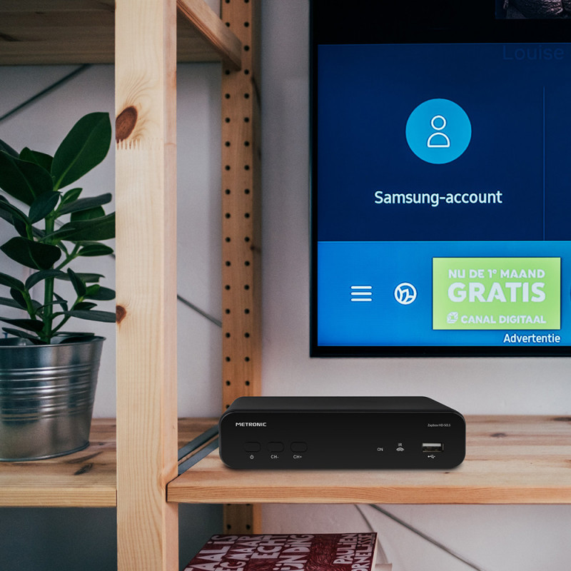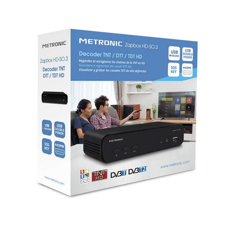 Ce décodeur TNT permet de regarder et d'enregistrer en haute définition lensemble des chaînes numériques terrestres françaises émises en DVB-T et DVB-T2. Le port USB Double Power du décodeur permet d'enregistrer sur un disque dur externe les émissions des chaînes TNT ou de lire les contenus multimédias présents sur une clé USB ou un disque dur externe.Ce décodeur TNT est très simple d'utilisation. Il suffit d'appuyer sur la touche OK pour l'installer.Il est également équipé d'une touche SOS qui permet de récupérer facilement les chaînes perdues en cas d'évolution de la numérotation des chaînes.Avec sa fonction "blocage parental par codes CSA", les programmes aux contenus violents/érotiques sont automatiquement bloqués.