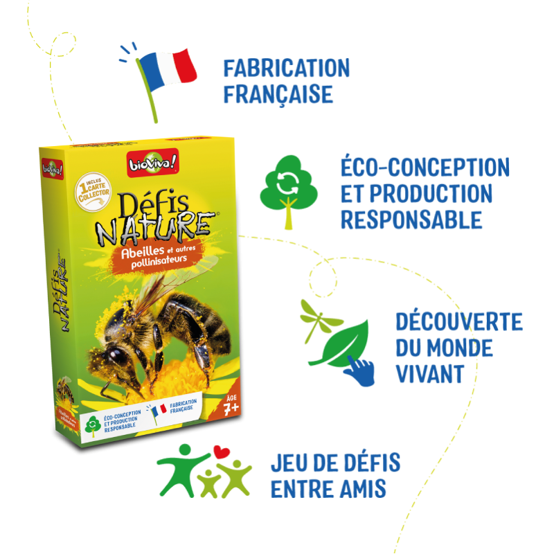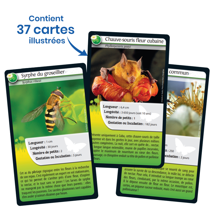 Partez à la découverte des abeilles et des autres animaux pollinisateurs. Découvrez leurs caractéristiques et pariez sur leurs points forts pour gagner la bataille ! Alors, prêts à relever le défi? Caractéristiques : Longueur – Longévité – Nombre de petits – Gestation ou Incubation Pastille : Degré de menace qui pèse sur l’espèce (non menacée, vulnérable, en danger d’extinction, en danger critique d’extinction) De 2 à 6 joueurs. Dès 7 ans. Fabriqué en France de manière éco-responsable.