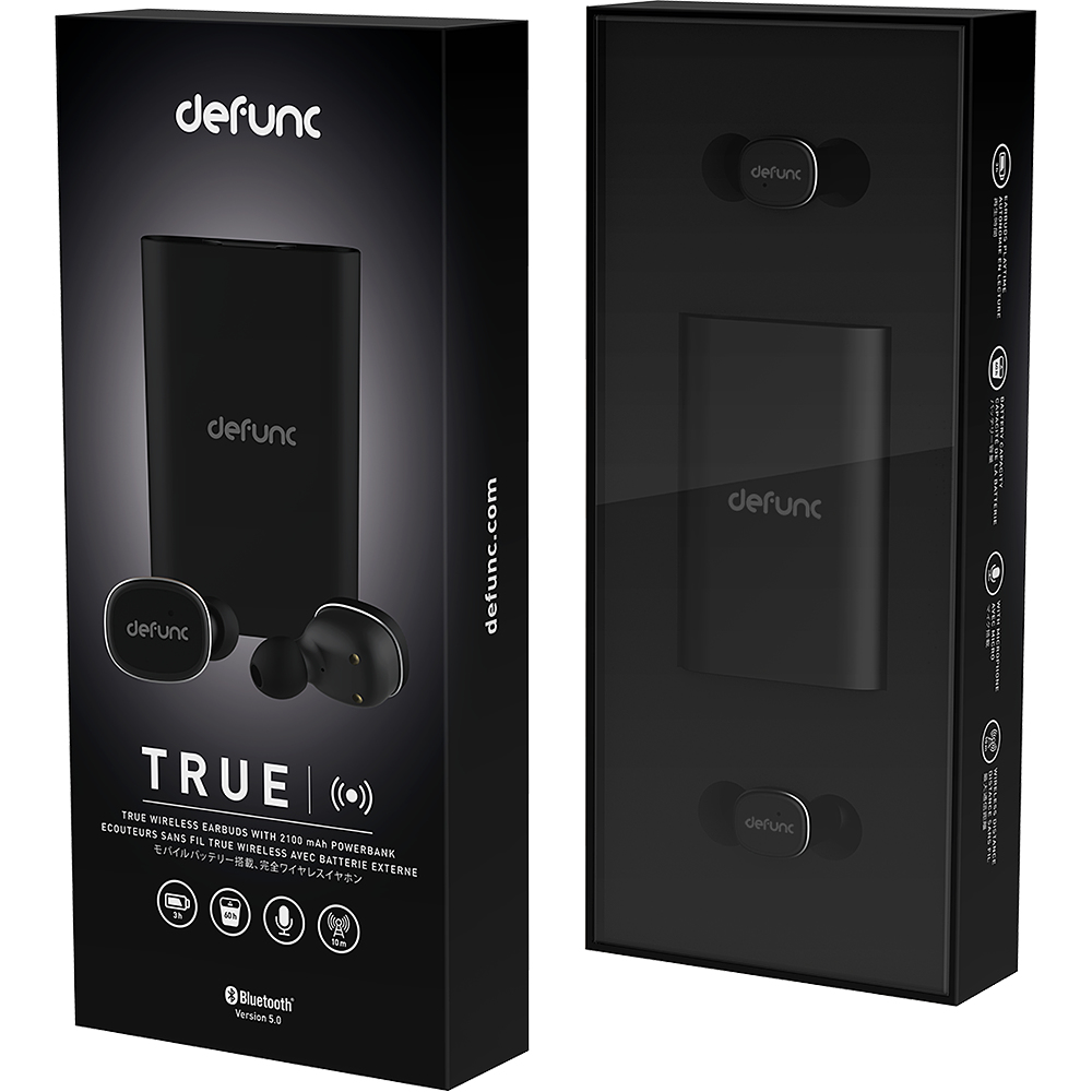 DEFUNC TRUE. Type de produit: Casques. Technologie de connectivité: Sans fil, Bluetooth. Utilisation recommandée: Appels/Musique. Portée du routeur sans fil: 10 m. Couleur du produit: Noir