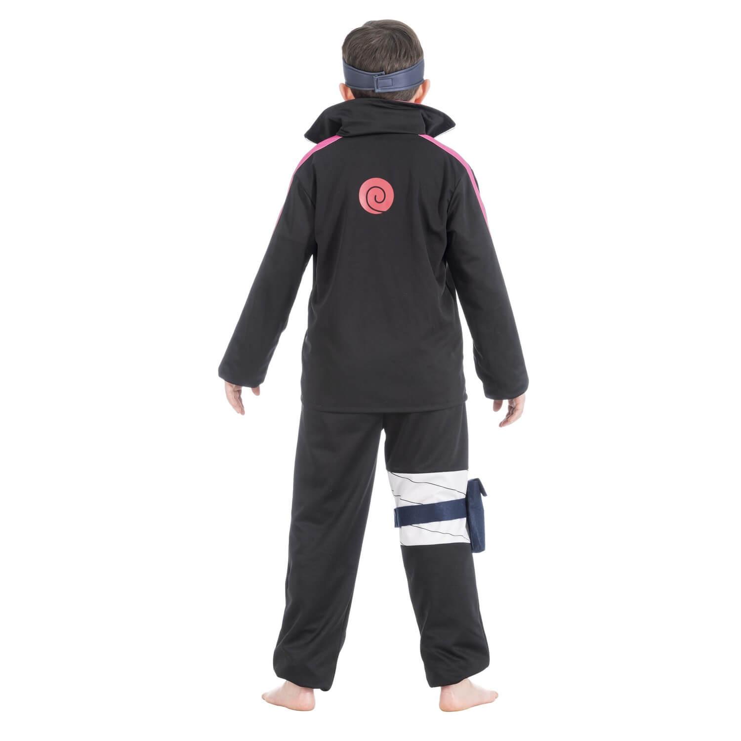 Le symbole du clan Uzumaki est présent sur le dos de la veste et le pantalon comporte une pochette. Le bandeau avec le symbole de Konoha est identique à celui de Naruto.