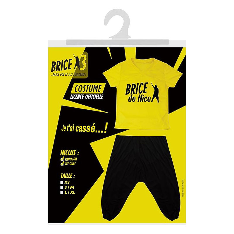 - T-shirt Jaune Éclatant : Au centre du t-shirt, l'emblématique inscription "BRICE de Nice" s'affiche fièrement, accompagnée de l'ombre stylisée de Brice en pleine action de "casser", apportant une touche d'authenticité et d'humour à ce costume.
