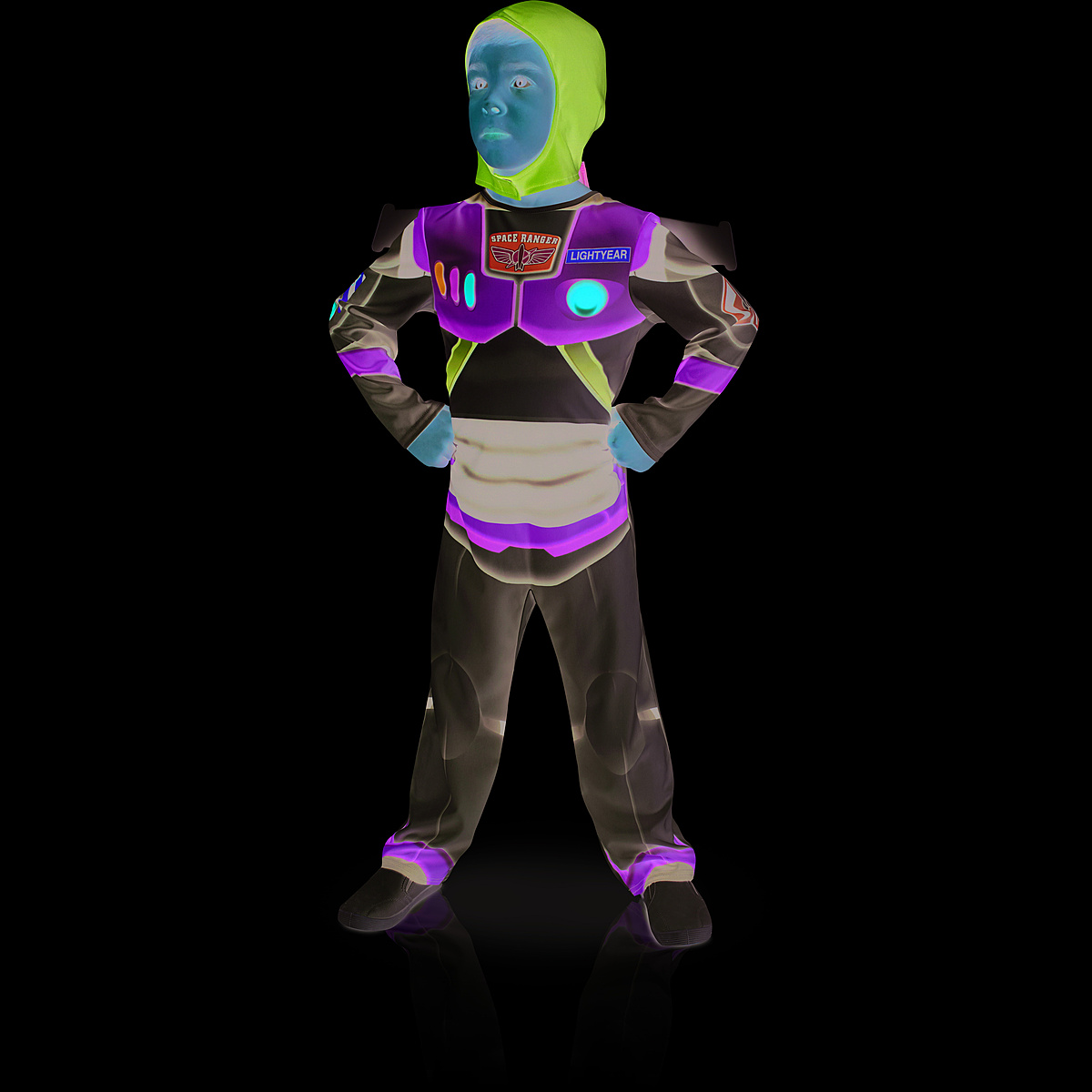 Buzz l'éclair taille M comprenant une combinaison imprimée, une cagoule et des ailes EVA amovibles.