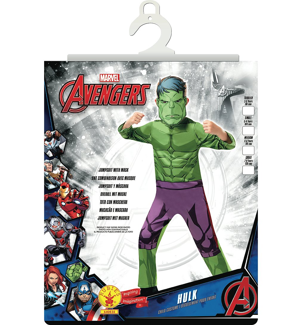 | La boîte contient | - Une combinaison en tissu imprimé au recto à leffigie du super héro Hulk - Un masque ½ en feutrine |