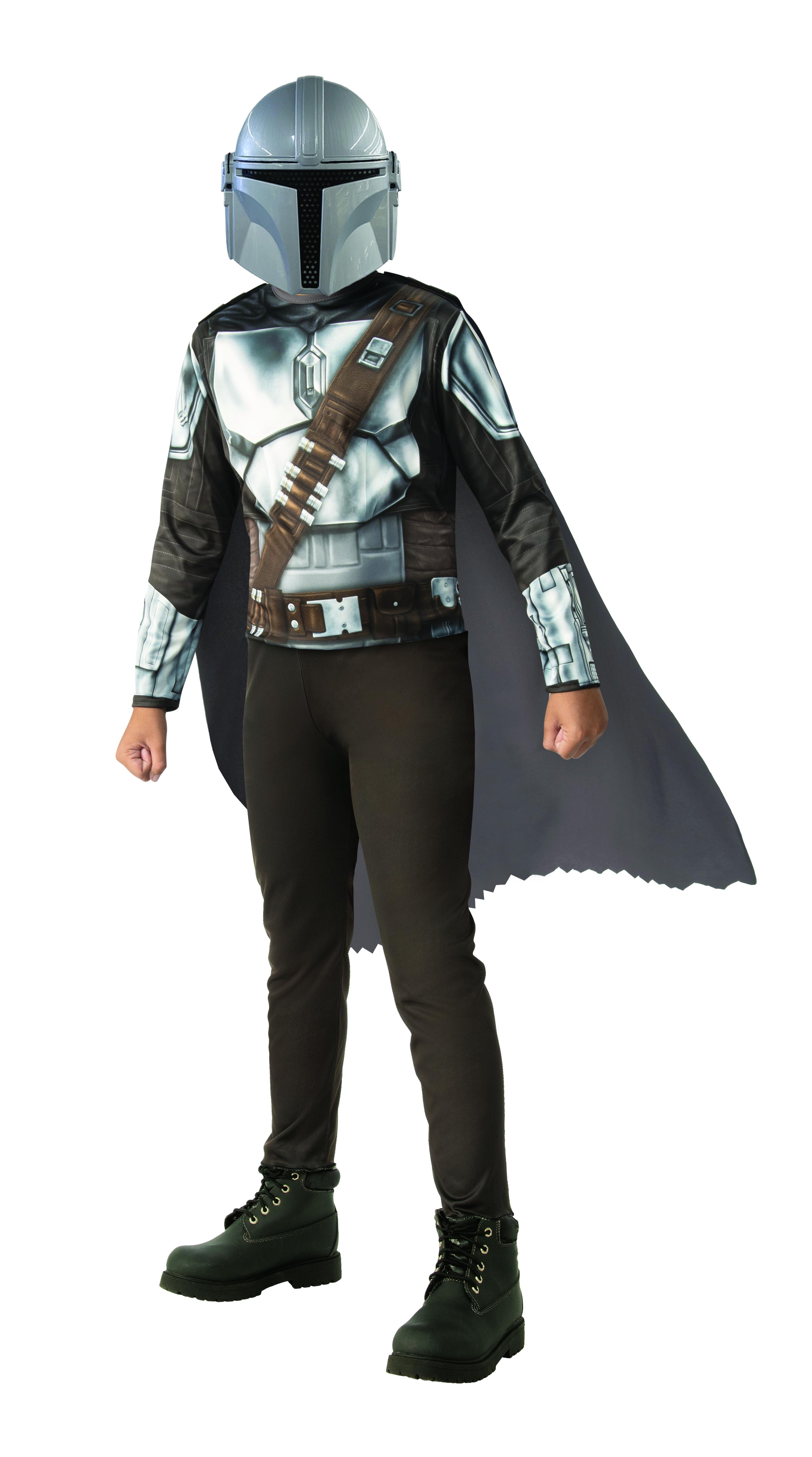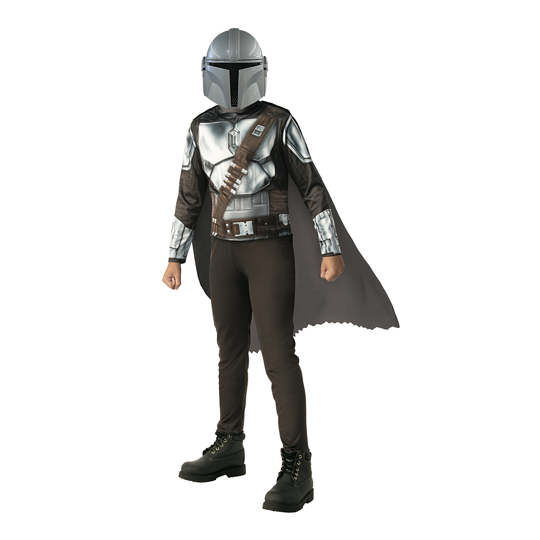 Une combinaison à manches longues en tissu jersey imprimée imitation « armure ». Une cape longue en tissu avec attaches velcro sur les épaules. Un masque en PVC à l’effigie du Mandalorian avec attache élastique à l’arrière.