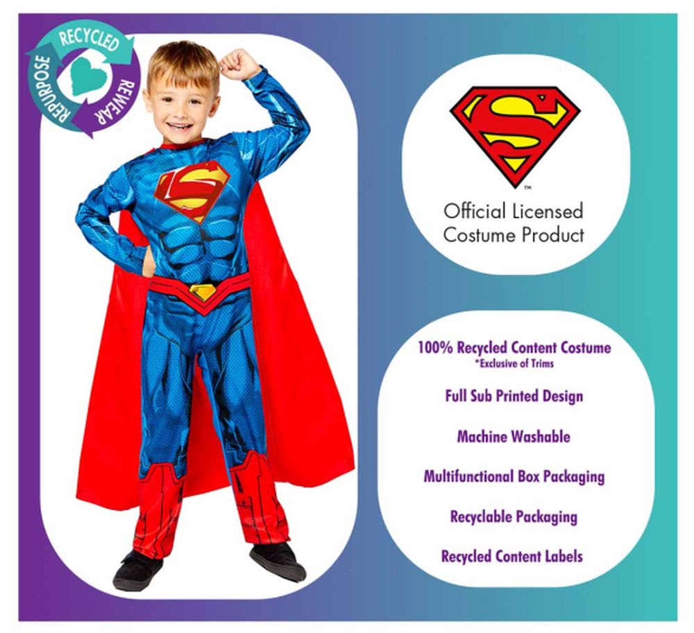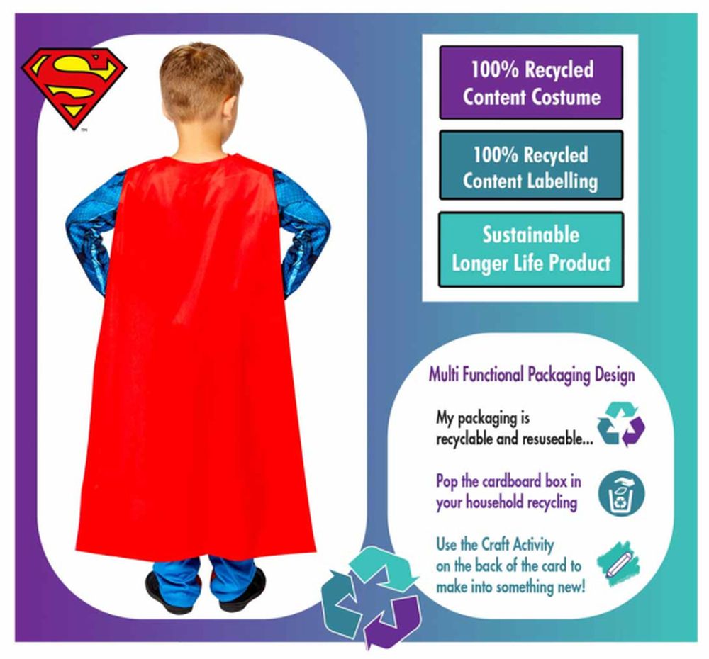 Déguisement Costume enfant Superman combinaison + cape taille 3-4 ans Costume durable et écologique Caractéristiques : Combinaison et cape longue imprimées. Taille 3 - 4 Ans Pour un plaisir durable supplémentaire, un accessoire à colorier sur carte recyclée est inclus. Ce déguisement durable et réutilisable est conçu pour être aussi respectueux de l'environnement que possible. Il est fabriqué à partir de matériaux 100 % recyclés et est lavable en machine pour une utilisation répétée. Le costume est uniquement imprimé en sous-traitance, sans utiliser de paillettes ni de procédés supplémentaires. Comme vous pouvez vous y attendre, il a passé tous les tests de sécurité des jouets de l'Union européenne. Nous avons supprimé tous les éléments en plastique de l'emballage afin qu'il puisse être entièrement recyclé.