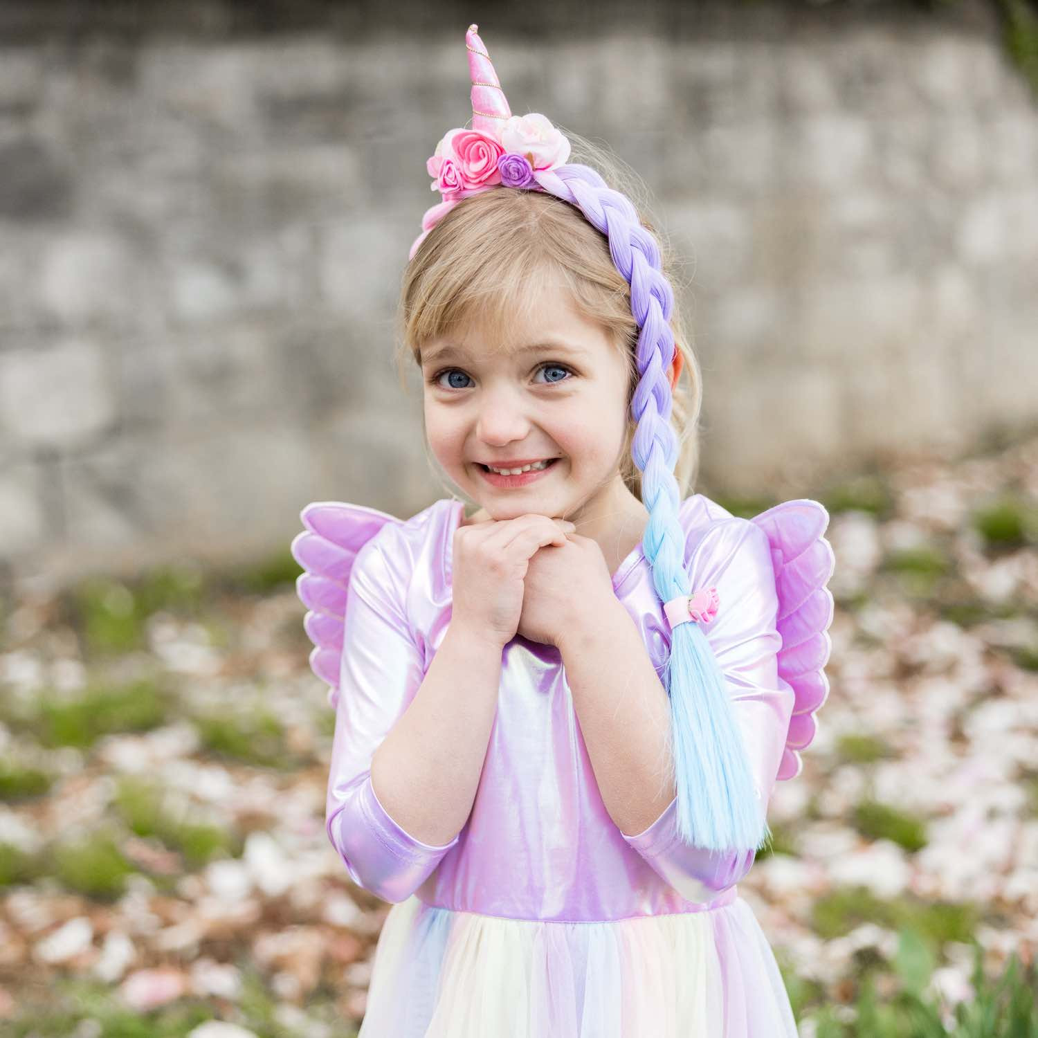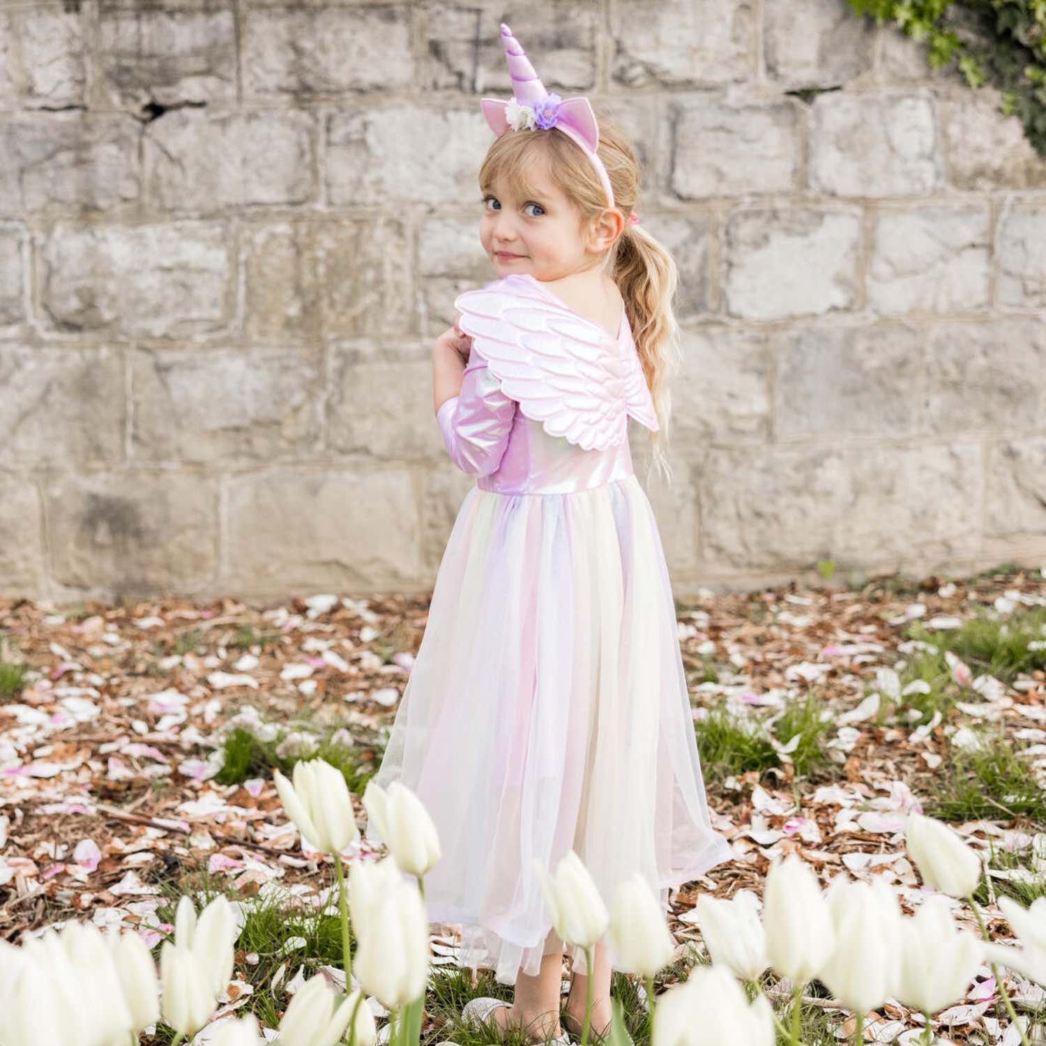- Robe de princesse licorne irisée inspirée du Pégase, avec ailes magiques amovibles et bandeau assorti.