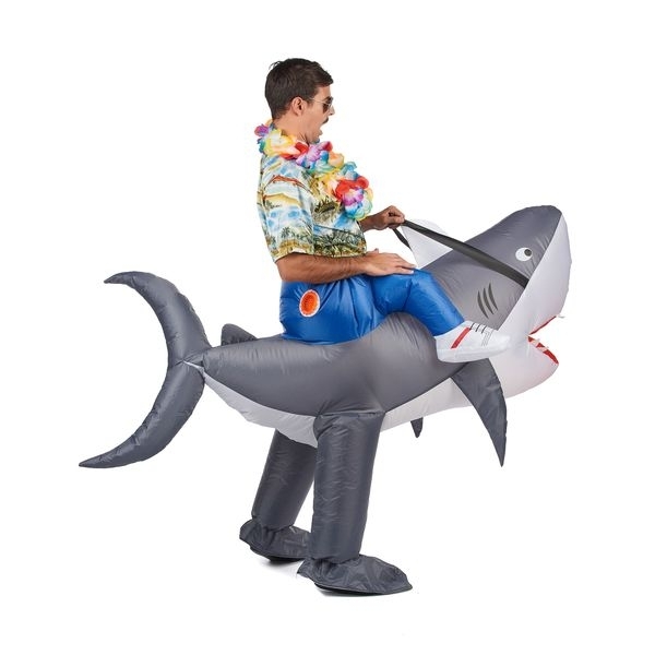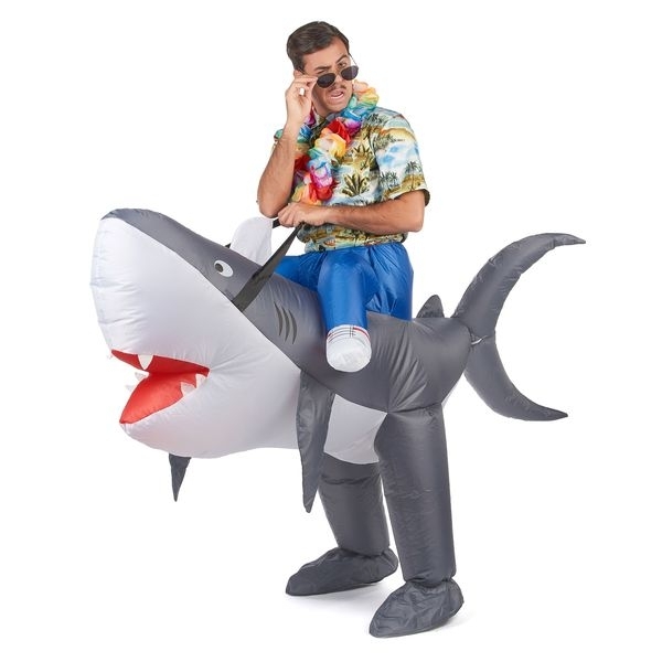 Ce déguisement requin à chevaucher est la tenue à enfiler pour impressionner tout le monde. Il est fait en tissu et il est facile à enfiler. Il dispose d'un système de gonflage et fonctionne avec des piles. Ce requin à dompter vous plaire cer* Taille : adulte, taille unique * Couleur : bleu, rouge, gris, blanc * Matière : tissu * Système de gonflage : inclus * Batterie : 4 piles LR6 (non fournies) Fonctions : déguisement Contenu : 1 costume gonflable chevauchant un requin, 1 système de gonflage