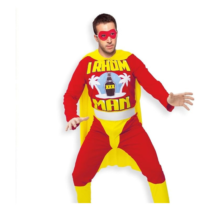 Le déguisement I Rhum Man se compose d'une combinaison rouge et jaune, d'une cape assortie, d'une ceinture et d'un masque pour compléter le look de super-héros. Ce costume en polyester est conçu pour s'adapter à toutes les morphologies adultes grâce à sa taille unique. Parfait pour des moments mémorables avec vos amis, ce déguisement ne manquera pas de faire sensation !