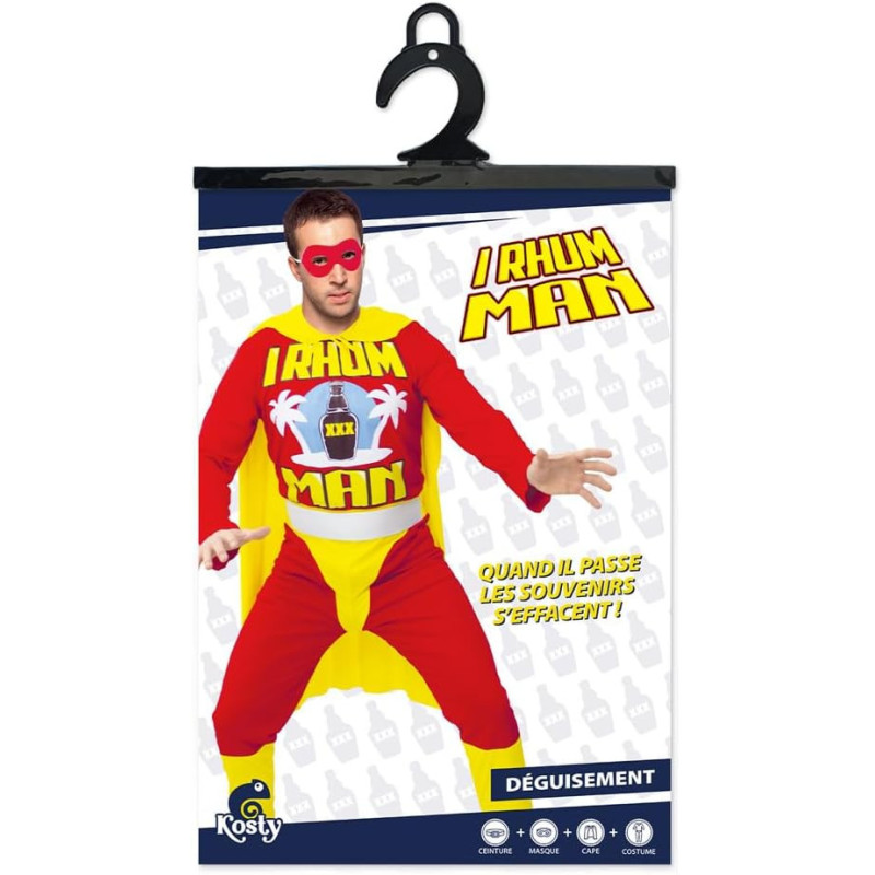 Que ce soit pour un enterrement de vie de garçon ou toute fête à thème, enfilez le costume d'I Rhum Man et embarquez dans une mission de la plus haute importance : sauver les assoiffés et apporter de la joie à vos soirées. Attention, l'abus d'alcool est dangereux pour la santé, à consommer avec modération !