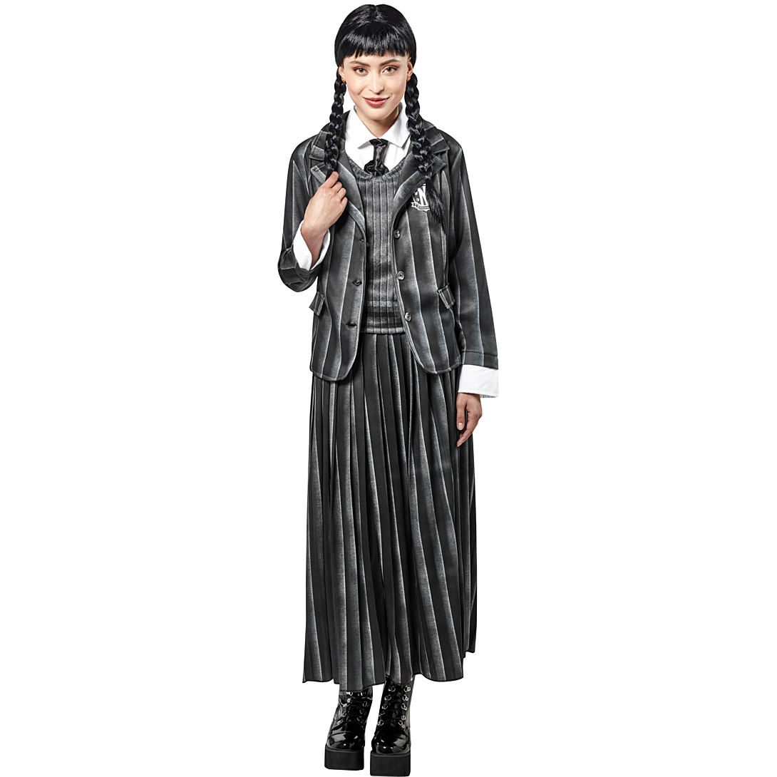Un haut en jersey imprimé avec col et cravate intégrés. Une veste en jersey imprimée avec blason « Nevermore academy ». Une jupe longue assortie avec taille élastique.