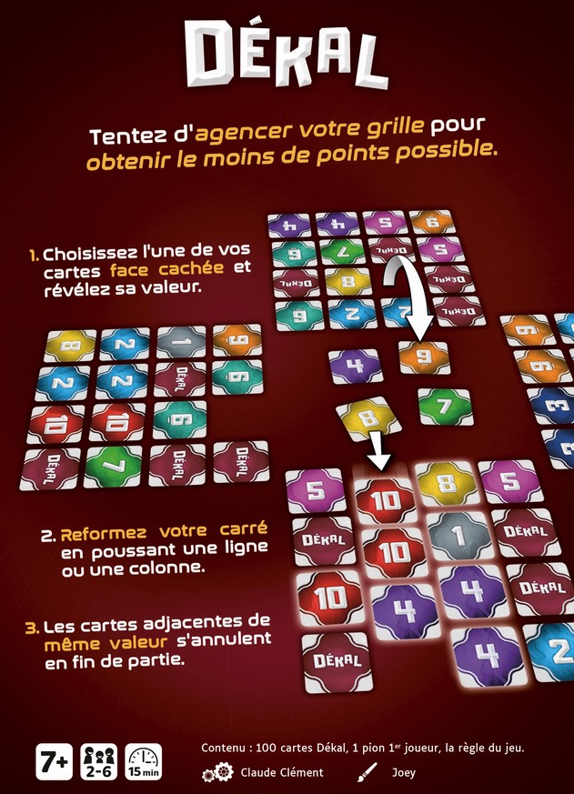 Dans Dékal, agencez au mieux votre grille de cartes afin d'obtenir le moins de points possible. À chaque tour, jouez une carte puis reformez un carré parfait en poussant une ligne ou une colonne. En fin de partie, les cartes adjacentes de même valeur s'annulent, ce qui permet de marquer moins de points.